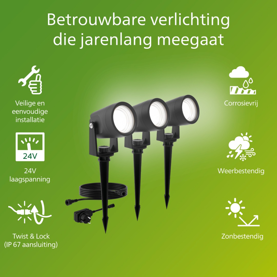 Een leuke set van 3 grondspots uit het Gardenlink systeem waar je eenvoudig objecten en muren mee kan uitlichten. Met deze set kan je eenvoudig beginnen, want bij de spots wordt een voeding en verlengkabel meegeleverd. Plug en play dus! Heb je meer ruimte tussen de spots nodig? Dat kan met de los verkrijgbare verlengkabels. Met dit systeem kun je eenvoudig diverse laagspannings armaturen en snoeren met elkaar verbinden om zo je hele tuin te verlichten. En ben je het zat? Dan kan je het eenvoudig ook weer verleggen.