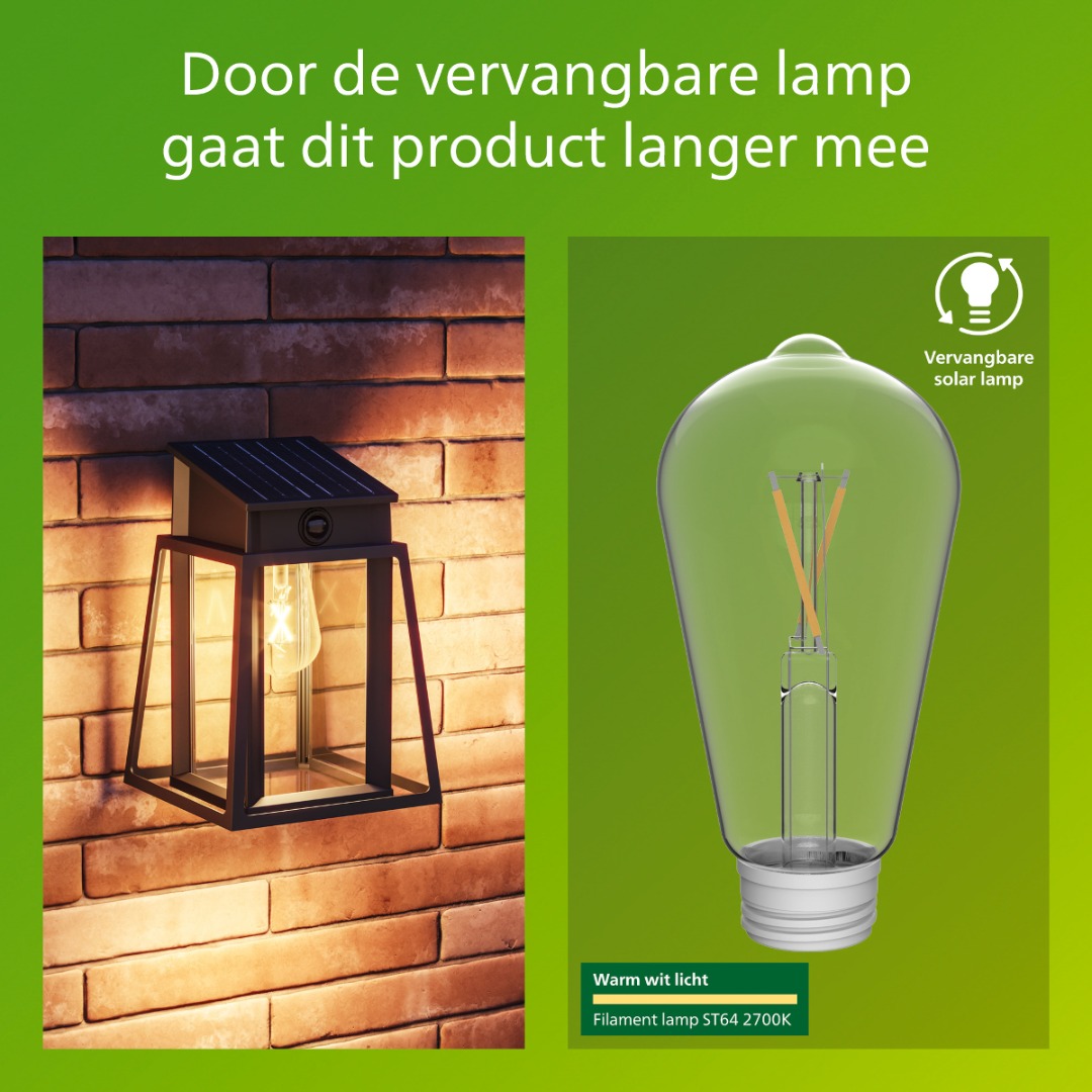 Een moderne, leuke wandlamp uit de Solar collectie van Philips. De lamp werkt op solar, dus heel eenvoudig monteren op de wandbeugel, de zon de lamp laten opladen en genieten maar. Het fijne aan deze lamp is, is dat deze speciale solar lamp verwisselbaar is. Daarnaast kan je deze lamp op 3 standen instellen. Hij kan helemaal uit. Je kan volledige lichtstand aandoen, dat houdt in dat het licht dimt wanneer er niemand is en zodra de sensor beweging detecteert gaat de lamp automatisch helderder licht schijnen. Of je kan de lamp op auto stand zetten dan is deze uit, en gaat hij aan zodra beweging gedetecteert wordt. Zo creëer je een veilig gevoel en heb je licht wanneer je dat nodig hebt en verbruik je minder energie.