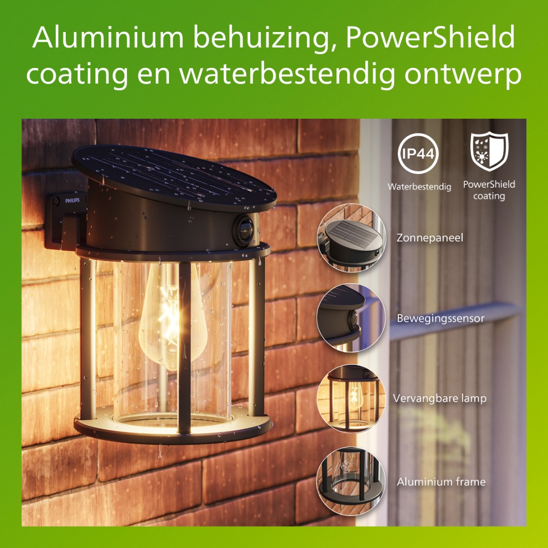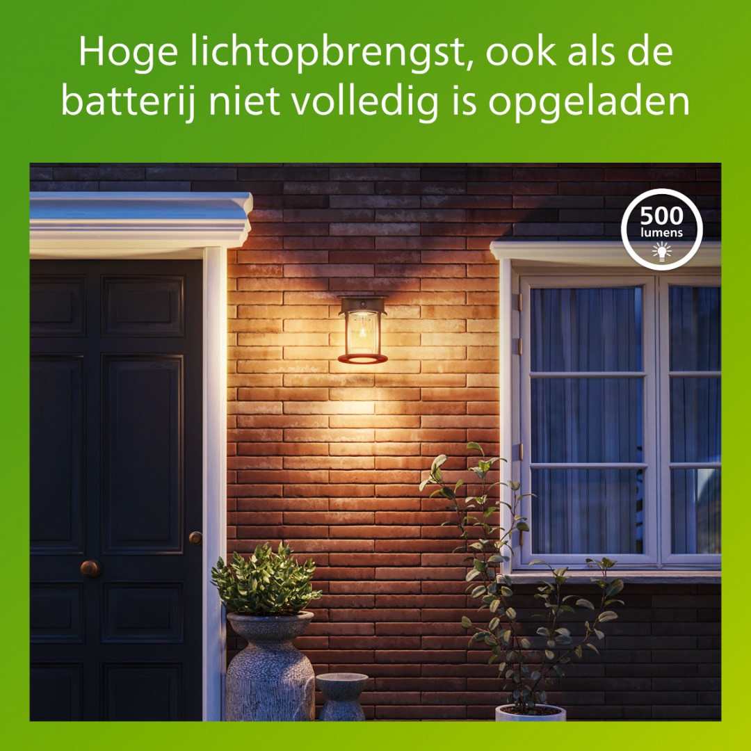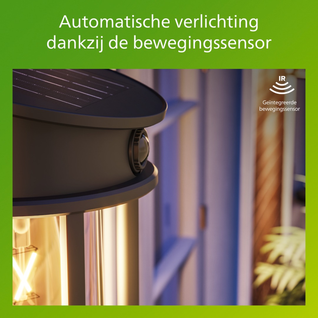 Een moderne, leuke wandlamp uit de Solar collectie van Philips. De lamp werkt op solar, dus heel eenvoudig monteren op de wandbeugel, de zon de lamp laten opladen en genieten maar. Het fijne aan deze lamp is, is dat deze speciale solar lamp verwisselbaar is. Daarnaast kan je deze lamp op 3 standen instellen. Hij kan helemaal uit. Je kan volledige lichtstand aandoen, dat houdt in dat het licht dimt wanneer er niemand is en zodra de sensor beweging detecteert gaat de lamp automatisch helderder licht schijnen. Of je kan de lamp op auto stand zetten dan is deze uit, en gaat hij aan zodra beweging gedetecteert wordt. Zo creëer je een veilig gevoel en heb je licht wanneer je dat nodig hebt en verbruik je minder energie.