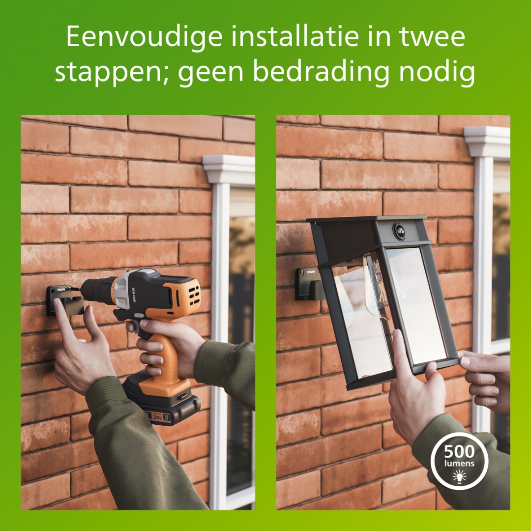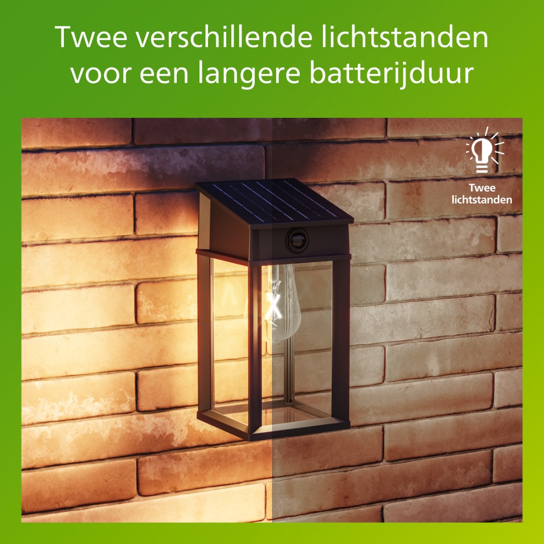 Een moderne, leuke wandlamp uit de Solar collectie van Philips. De lamp werkt op solar, dus heel eenvoudig monteren op de wandbeugel, de zon de lamp laten opladen en genieten maar. Het fijne aan deze lamp is, is dat deze speciale solar lamp verwisselbaar is. Daarnaast kan je deze lamp op 3 standen instellen. Hij kan helemaal uit. Je kan volledige lichtstand aandoen, dat houdt in dat het licht dimt wanneer er niemand is en zodra de sensor beweging detecteert gaat de lamp automatisch helderder licht schijnen. Of je kan de lamp op auto stand zetten dan is deze uit, en gaat hij aan zodra beweging gedetecteert wordt. Zo creëer je een veilig gevoel en heb je licht wanneer je dat nodig hebt en verbruik je minder energie.