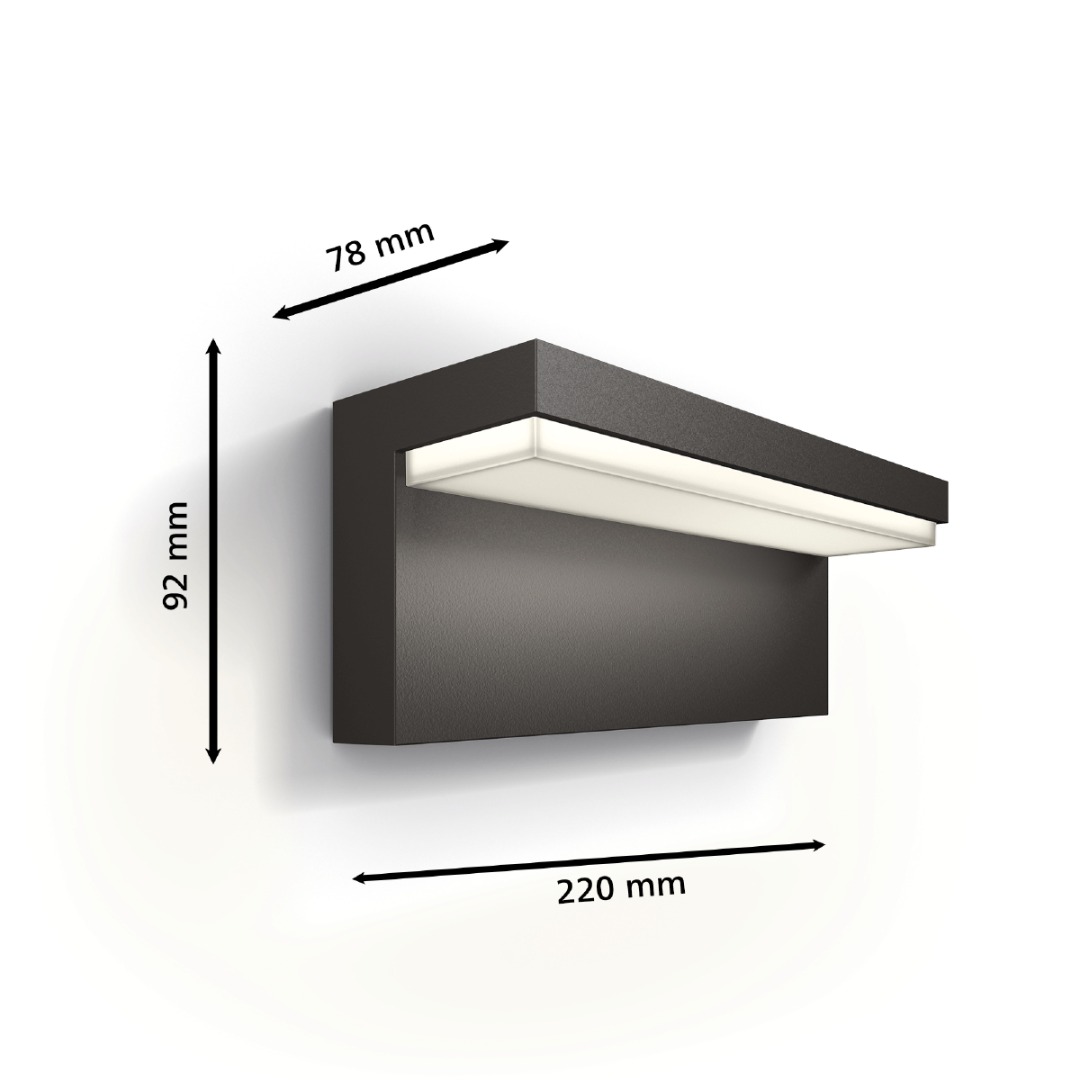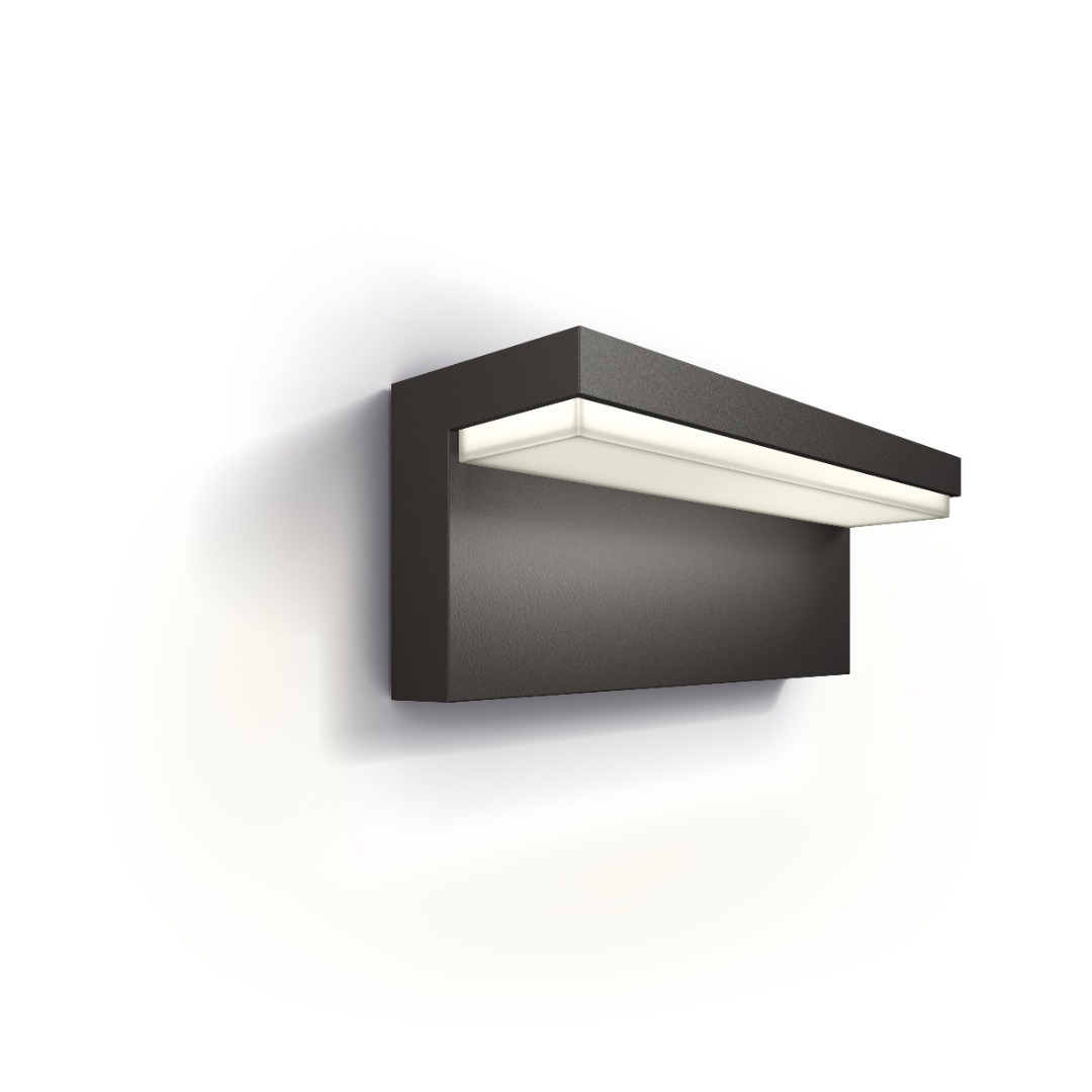 Een moderne wandlamp van Philips uit de outdoor collectie met een antraciet design. De lamp heeft warm wit licht af en heeft een zuinige led lichtbron van maar 3,8W, Leuk om te combineren met alle andere lampen uit dezelfde serie. De lamp heeft een IP waarde van 44 en is daarmee bestendig tegen diverse weersomstandigheden.