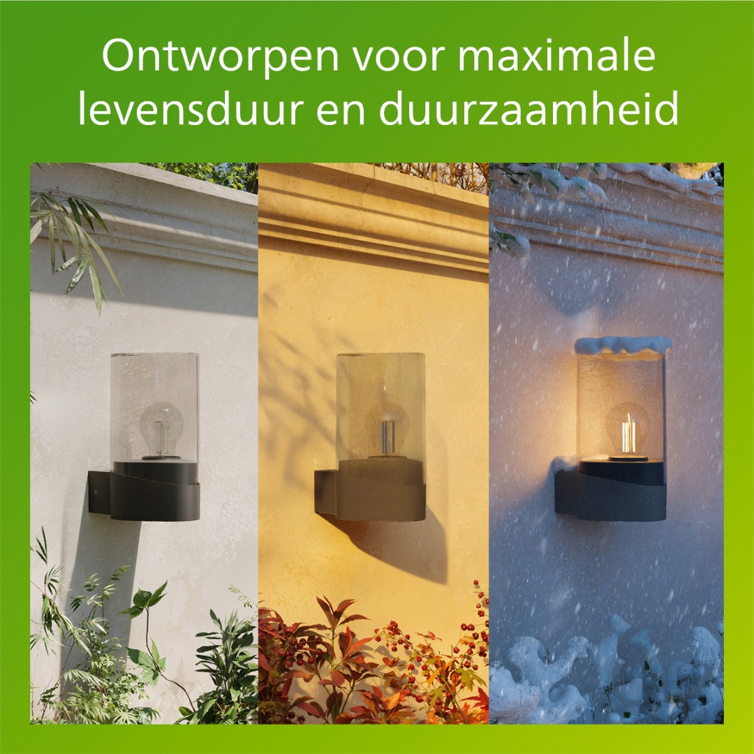 Een leuk, opwaarts model wandlamp van Philips in een antracietkleur. De lamp wordt geleverd met een zuinige ultra efficient ledlichtbron van 4W en deze schijnt warm wit licht van 2700K. Door de glazen kap wordt het licht mooi rondom versrpreid. Met een IP waarde van 44 is deze lamp geschikt voor diverse weersomstandigheden.