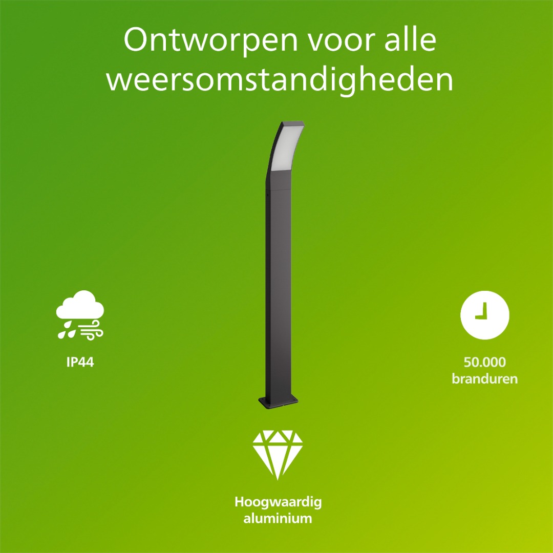 Een moderne vloerlamp uit de outdoor collectie van Philips. De lamp heeft een ultra efficient ledlichtbron die zuiniger is dan voorheen. Deze verbruikt maar 4,3W en schijnt warm wit licht van 2700K. Deze vloerlamp is erg leuk om langs uw tuinpad of veranda te plaatsen en is verkrijgbaar in zowel een kleine als grote variant. Het betreft hier de grote variant van 96 cm. Met een IP waarde van 44 is deze lamp bestendig tegen diverse weersomstandigheden.