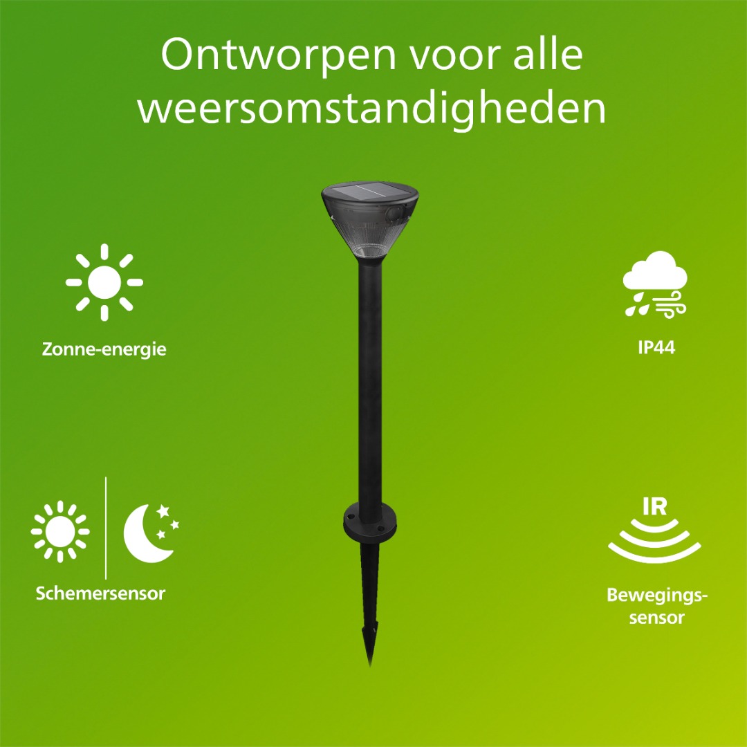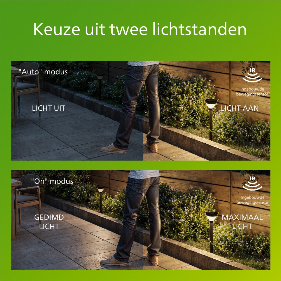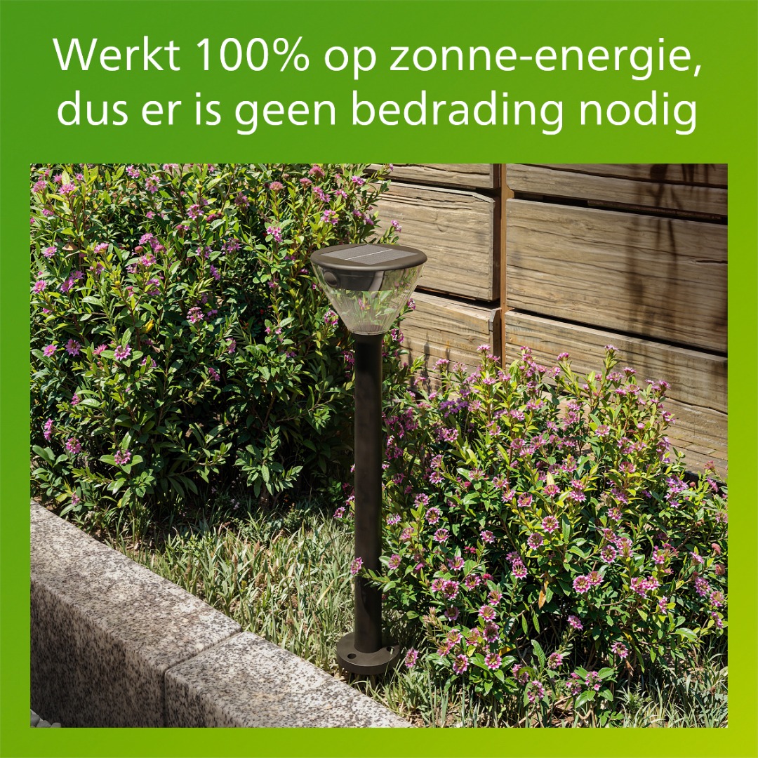 Een leuke vloerlamp uit de Solar Outdoor collectie van Philips. Het fijne aan deze solar lamp is dat er geen ingewikkeld installatiewerk nodig is. Eenvoudig de lamp in de grond steken, laten opladen door de zon en dan genieten van het warme licht wat de lamp verspreid. Door de matte kap zorgt dit ervoor dat het licht heel zacht en gelijkmatig wordt verspreid. En door de ingebouwde dag/nachtsensor wordt de lamp alleen ingeschakeld zodra de zonsondergang start en gaat hij automatisch weer uit als de zonsopgang zijn intrede maakt. Zo heb je alleen licht wanneer je het echt nodig hebt. En of dat nog niet genoeg is, heeft de lamp ook nog eens keuze uit 2 verschillende lichtstanden. Een waarbij de lamp uit is en bij beweging aangaat en een waarbij de lamp gedimd is en zodra er beweging gedetecteerd is hij maximaal aangaat. Kortom een strak design met vele mogelijkheden.