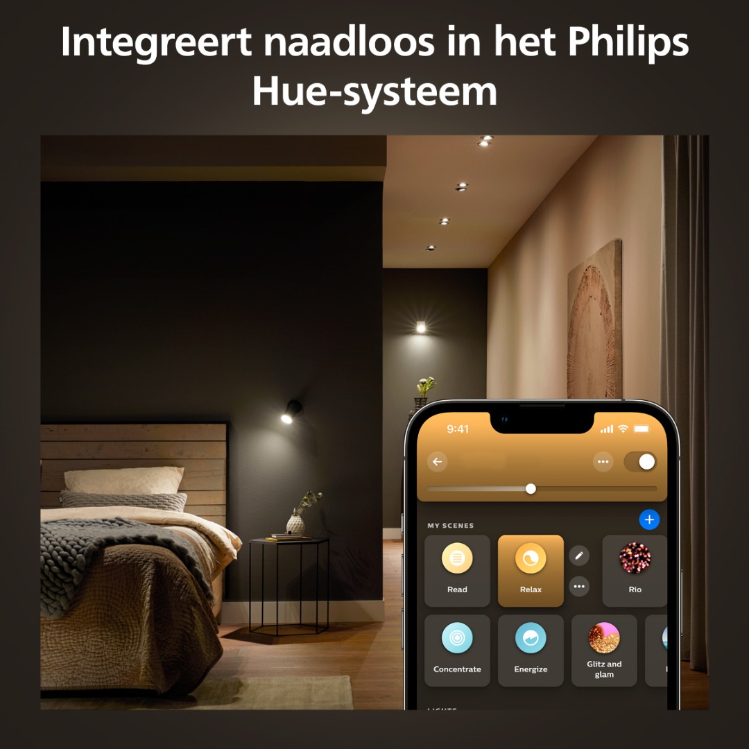 Met Philips Hue bepaal jij zelf welke sfeer je in huis wil hebben. Precies goed. Zonder kabels, een elektricien of installatiewerk, de lampen kunnen direct gedimd worden. Philips Hue biedt drie typen slimme lampen die in verschillende vormen, afmetingen en modellen worden geleverd. Kies Hue white voor eenvoudige bediening en comfort, Hue white ambiance voor ontspannend warmwit licht tot koel daglicht om je dagelijkse activiteiten te ondersteunen of Hue white and color ambiance voor een meeslepende ervaring. Ze werken allemaal samen om je woning slimmer, comfortabeler en energiezuiniger te maken.
