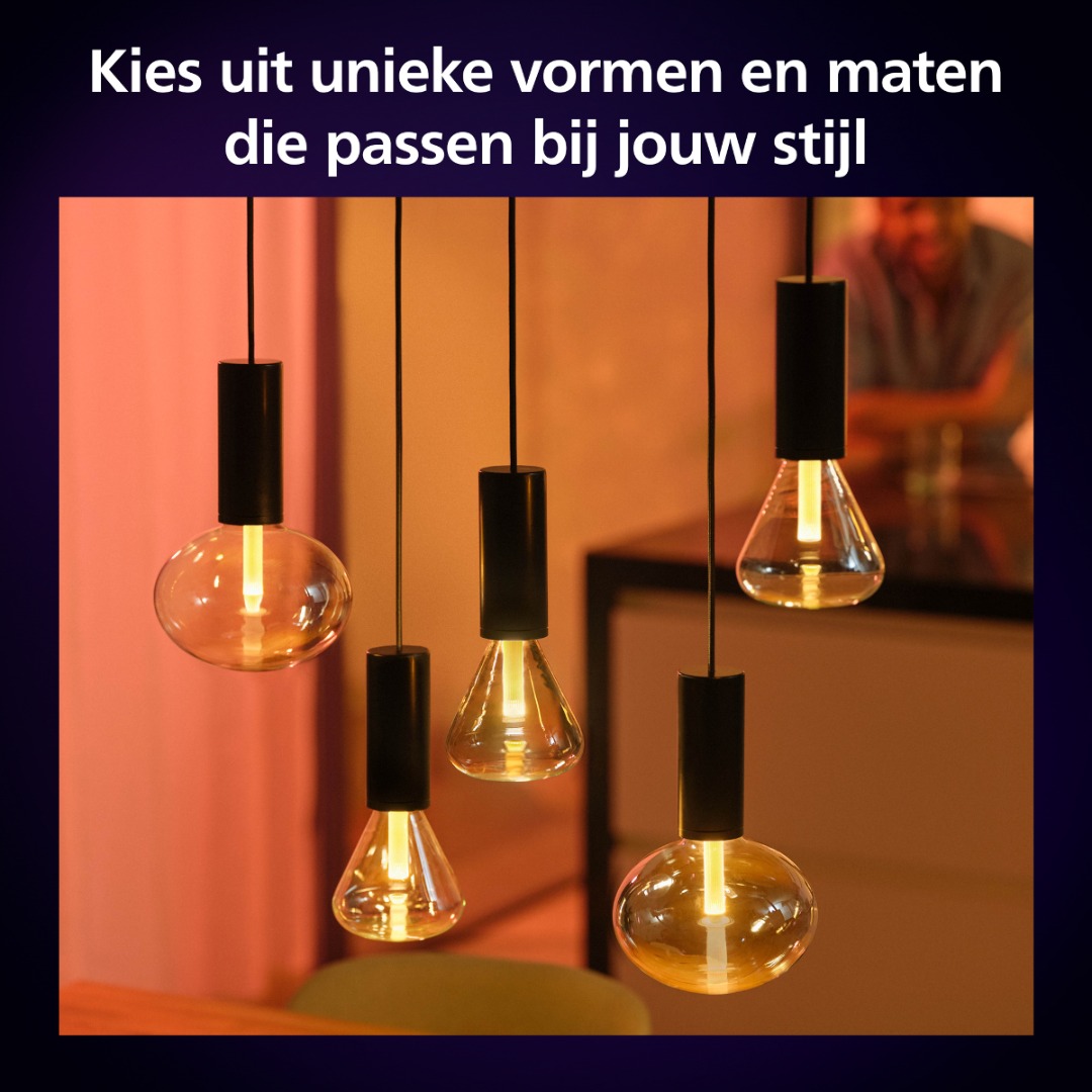 Met Philips Hue bepaal jij zelf welke sfeer je in huis wil hebben. Precies goed. Zonder kabels, een elektricien of installatiewerk, de lampen kunnen direct gedimd worden. Philips Hue biedt drie typen slimme lampen die in verschillende vormen, afmetingen en modellen worden geleverd. Kies Hue white voor eenvoudige bediening en comfort, Hue white ambiance voor ontspannend warmwit licht tot koel daglicht om je dagelijkse activiteiten te ondersteunen of Hue white and color ambiance voor een meeslepende ervaring. Ze werken allemaal samen om je woning slimmer, comfortabeler en energiezuiniger te maken.
