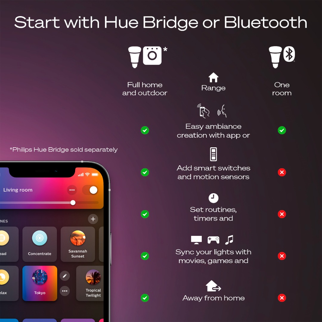 Met Philips Hue bepaal jij zelf welke sfeer je in huis wil hebben. Precies goed. Zonder kabels, een elektricien of installatiewerk, de lampen kunnen direct gedimd worden. Philips Hue biedt drie typen slimme lampen die in verschillende vormen, afmetingen en modellen worden geleverd. Kies Hue white voor eenvoudige bediening en comfort, Hue white ambiance voor ontspannend warmwit licht tot koel daglicht om je dagelijkse activiteiten te ondersteunen of Hue white and color ambiance voor een meeslepende ervaring. Ze werken allemaal samen om je woning slimmer, comfortabeler en energiezuiniger te maken.