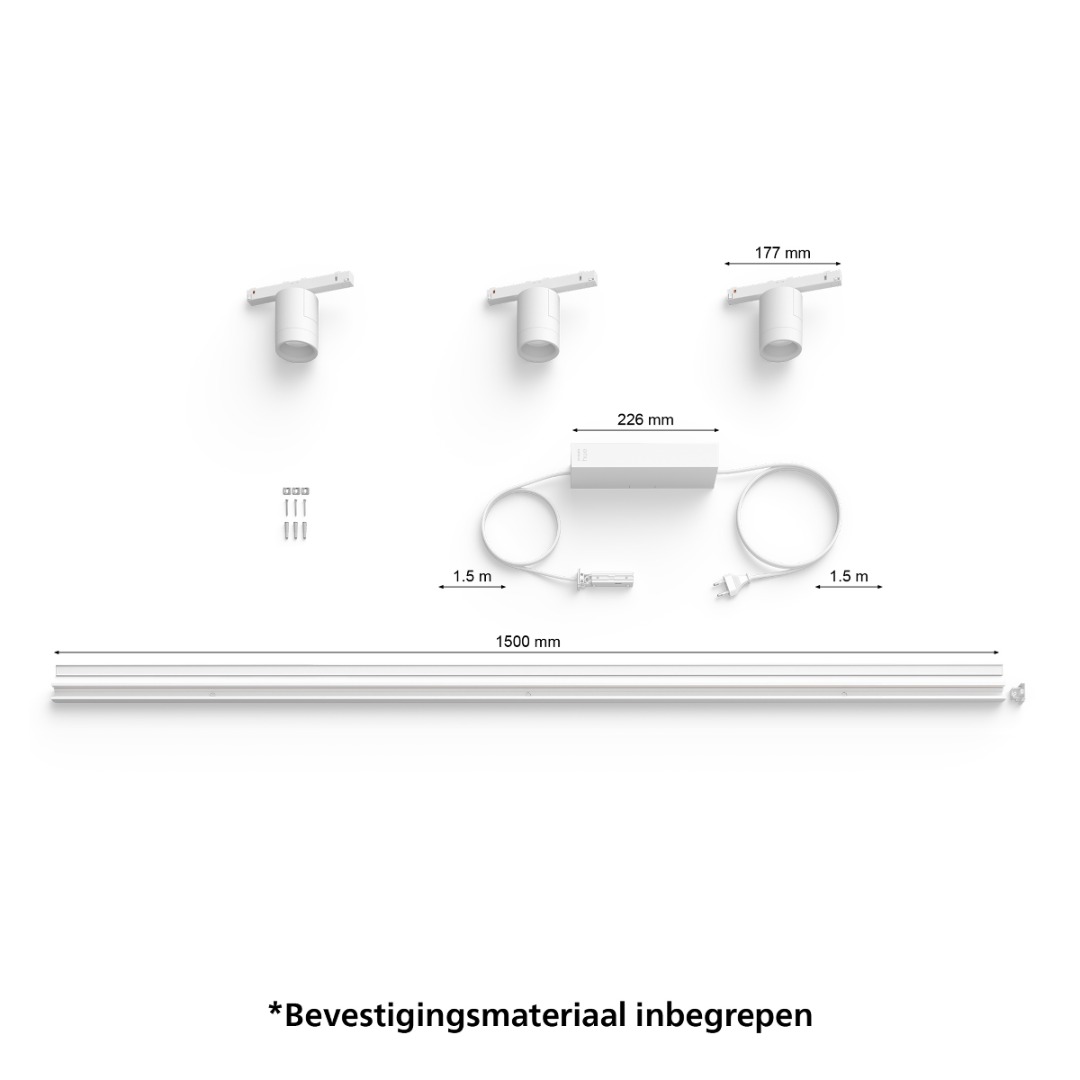 Een basisset uit het Perifo Railsysteem van Philips Hue in een prachtige witte kleur. Word designer in je eigen huis met het railsysteem van Philips Hue. Voeg eenvoudig lampen toe, plaats ze op de locatie waar jij wil, je kan echt alle kanten op. Volledig te personaliseren naar eigen wens en eenvoudig te bedienen vie de Hue app. In combinatie met de Hue Brigde (exclusief) maak je gebruik van alle mogelijkheden die Hue aanbiedt. Deze basisset bestaat uit 1 rail, een voeding en 3 spots. Dit railsysteem is geschikt voor wandmontage.