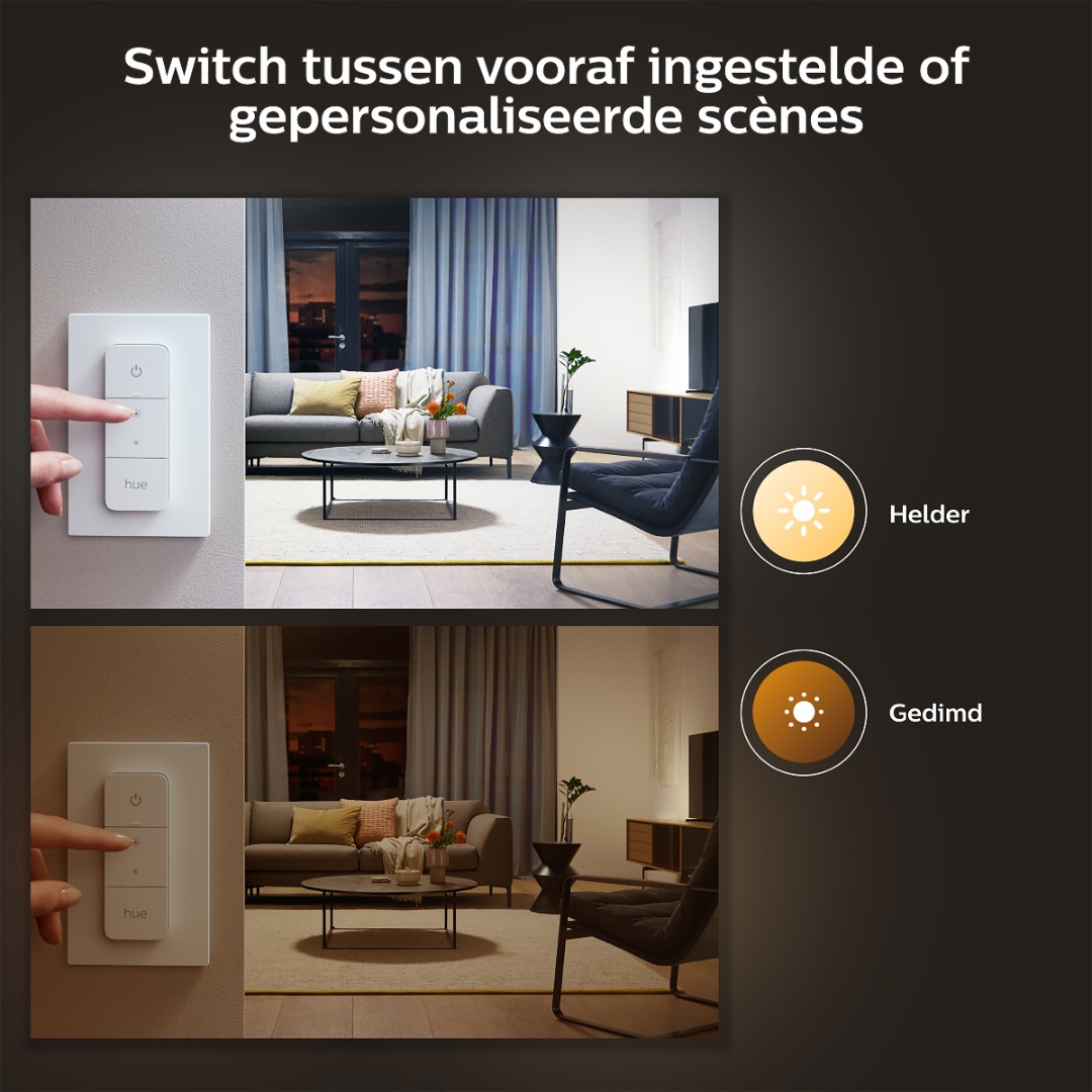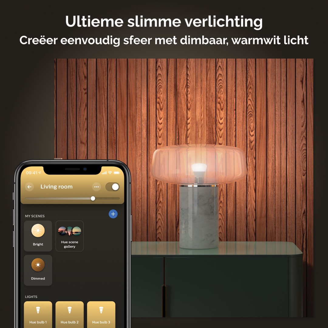 Haal meer uit je verlichting met een Philips Hue white starterkit E27, die bestaat uit drie Hue white LED-lampen die warmwit licht geven, een Hue bridge en een draadloze dimmer switch. De dimmer switch is een draadloze schakelaar waarmee je de lampen kunt in- en uistschakelen en waarmee je kunt kiezen uit verschillende voorgeprogrammeerde lichtrecepten. Draai de slimme lampen eenvoudig in je bestaande armaturen en koppel ze vervolgens moeiteloos via de Philips Hue app met de Hue bridge, het hart van je slimme systeem. Vanaf dat moment heb je toegang tot alle beschikbare slimme verlichtingsfuncties die Philips Hue te bieden heeft, zoals draadloos o.a. dimmen, routines en timers.