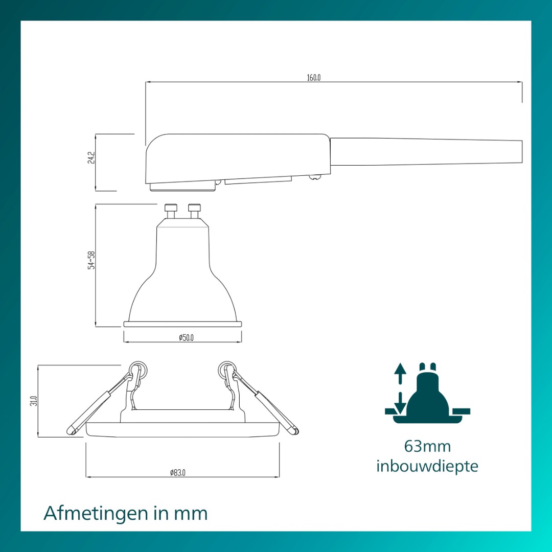 Een moderne inbouwspot in een witte kleur met een tijdloos design. De inbouwspots zitten in een set van 3 en worden geleverd zonder lichtbron en zo kun je zelf de gewenste lichtopbrengst kiezen. De lichtbron vervangen gaat ook heel eenvoudig doordat deze door de klemveer wordt vastgehouden. Zo hoef je alleen de veer los te klemmen om de lichtbron te vervangen zonder dat je het armatuur eruit hoeft te halen met kans op schade aan het plafond. Het armatuur zelf bevestig je met de ingebouwde clips, zo hoef je dus ook niet in het plafond te boren, alleen maar een gat te zagen, inpluggen en de klemmen houden de spot op zijn plaats. De spots hebben een IP waarde van 20 en zijn hiermee alleen geschikt voor binnengebruik en niet geschikt voor vochtige ruimtes zoals de badkamer of buiten.