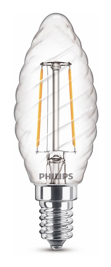 Een Philips LED lamp met gedraaide kaarsvorm. De lamp heeft een filament en verbruikt ongeveer 80% minder energie dan traditionele lampen.