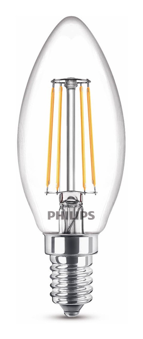 Een Philips LED lamp met kaarsvorm. De lamp heeft een filament en verbruikt ongeveer 80% minder energie dan traditionele lampen.