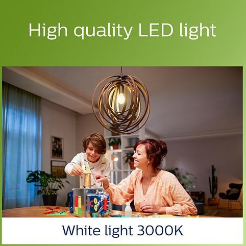 Een energiezuinige ledlamp uit de Groene lijn van Philips. Vertrouwde ledlampen in een vernieuwd, nog zuinig jasje. De lamp geeft warm wit licht van 3000K en is direct op volledige lichtsterkte. De mooie filament draden zorgen dat deze lamp gezien mag worden.