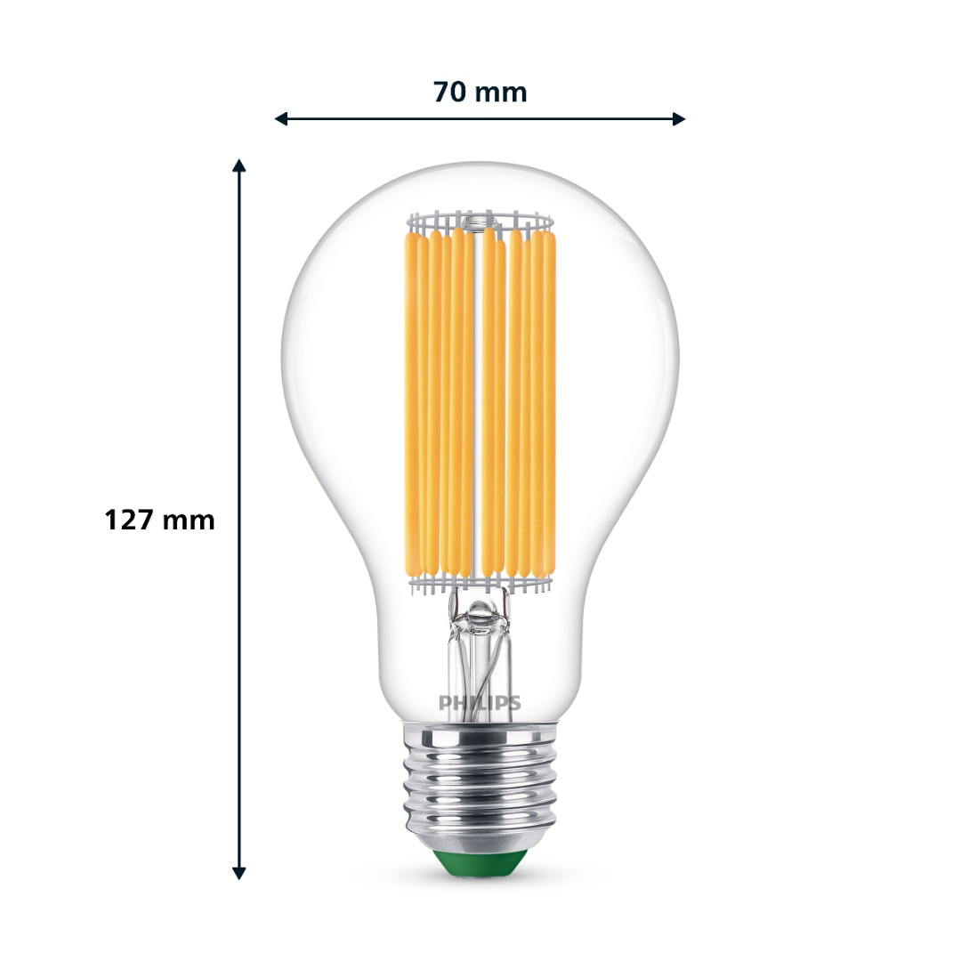 Een energiezuinige ledlamp uit de Groene lijn van Philips. Vertrouwde ledlampen in een vernieuwd, nog zuinig jasje. De lamp geeft warm wit licht van 3000K en is direct op volledige lichtsterkte. De mooie filament draden zorgen dat deze lamp gezien mag worden.