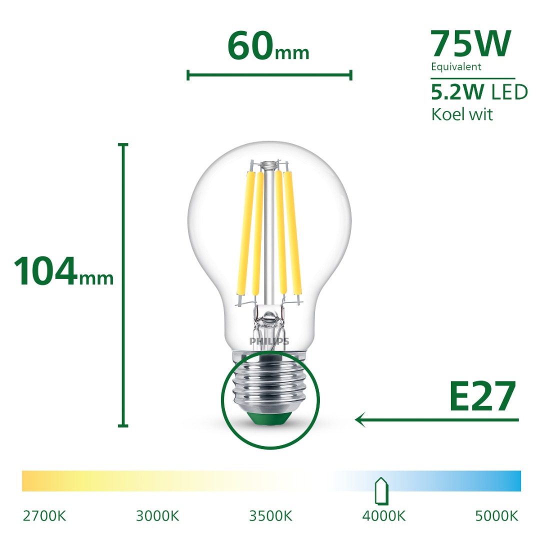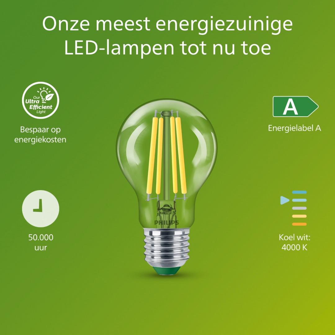 Een energiezuinige ledlamp uit de Groene lijn van Philips. Vertrouwde ledlampen in een vernieuwd, nog zuinig jasje. De lamp geeft koel wit licht van 4000K en is direct op volledige lichtsterkte. De mooie filament draden zorgen dat deze lamp gezien mag worden.