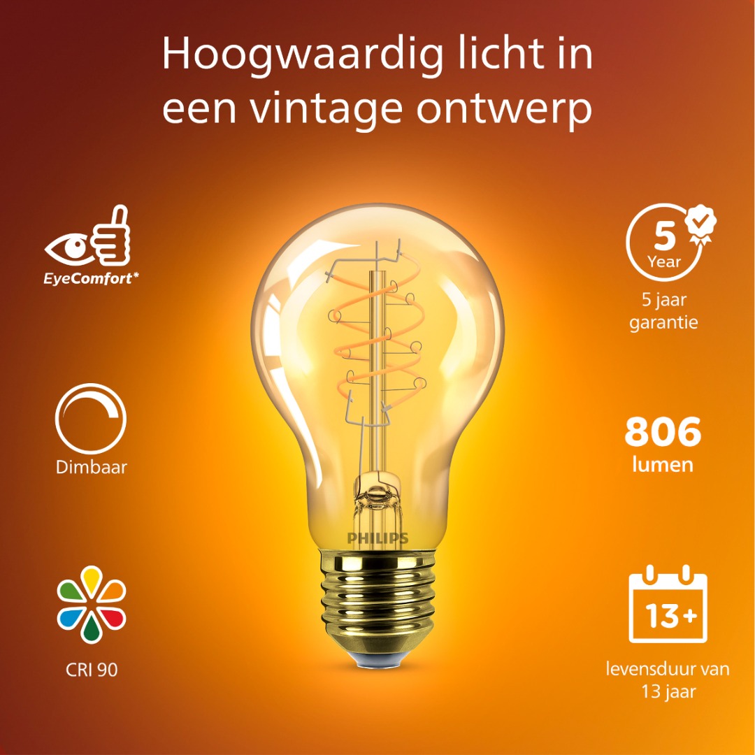 Een prachtige LED lamp uit de Vintage collectie lichtbronnen van Philips. De lamp heeft een standaardvorm en geeft extra warm wit licht (2200K). De lamp is dimbaar en heeft een mooie gloeidraad lopen door de lamp. Combineer de lamp met andere lampen uit de vintage lijn voor een mooie, speels effect.