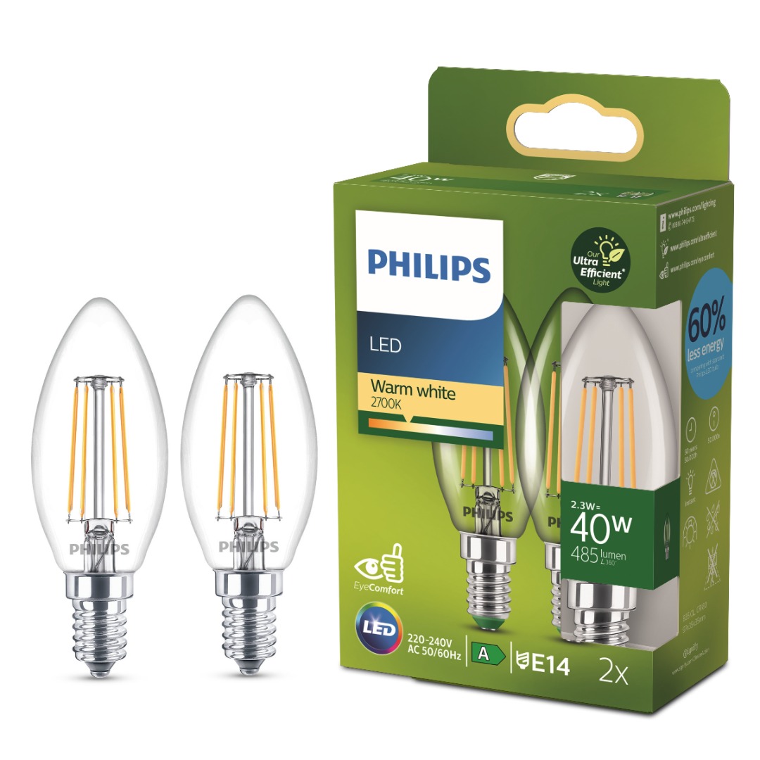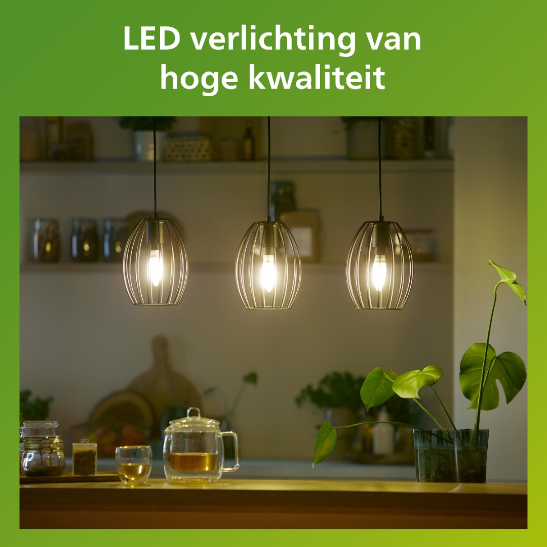 Een energiezuinige ledlamp uit de Groene lijn van Philips. Vertrouwde ledlampen in een vernieuwd, nog zuiniger jasje. De lamp in kaarsvorm geeft warm wit licht van 2700K en is direct op volledige lichtsterkte. De mooie filament draden zorgen dat deze lamp gezien mag worden.