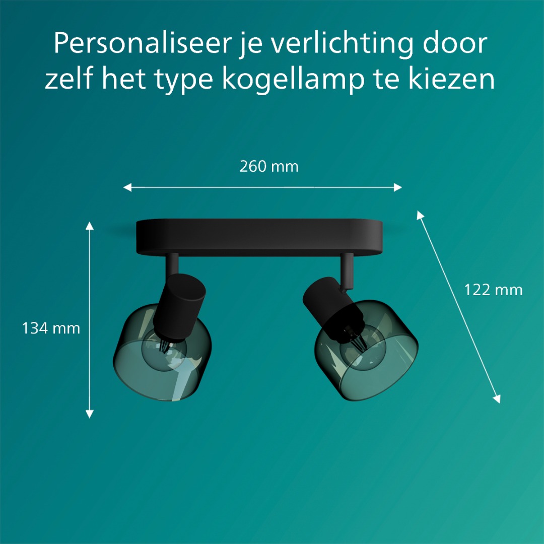 Een mooie moderne opbouwspot uit de Sleet collectie van Philips. Deze lijn combineert een mooi zwart armatuur met een smoke kleurig rond glas. Er zit 2x een E14 fitting geschikt voor een lichtbron van ieder max. 25W en deze wordt niet meegeleverd. Door de lengte van het glas kan hier het beste een kogellampje. Binnen de Sleet serie zijn ook nog andere opbouwspots met divers aantal lichtpunten leverbaar, leuk om met elkaar te combineren.