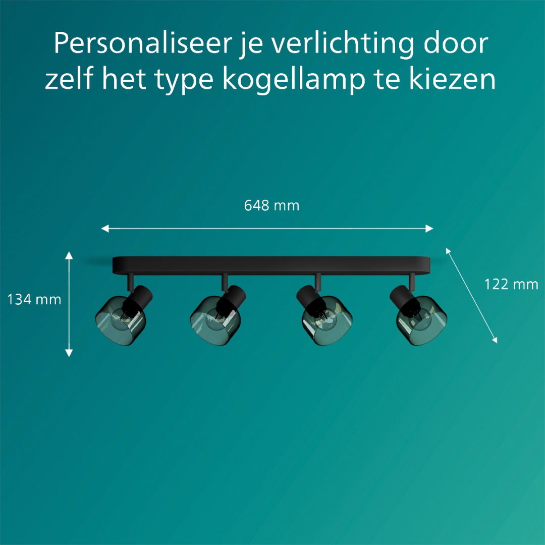 Een mooie moderne opbouwspot uit de Sleet collectie van Philips. Deze lijn combineert een mooi zwart armatuur met een smoke kleurig rond glas. Er zit 4x een E14 fitting geschikt voor een lichtbron van ieder max. 25W en deze wordt niet meegeleverd. Door de lengte van het glas kan hier het beste een kogellampje. Binnen de Sleet serie zijn ook nog andere opbouwspots met divers aantal lichtpunten leverbaar, leuk om met elkaar te combineren.