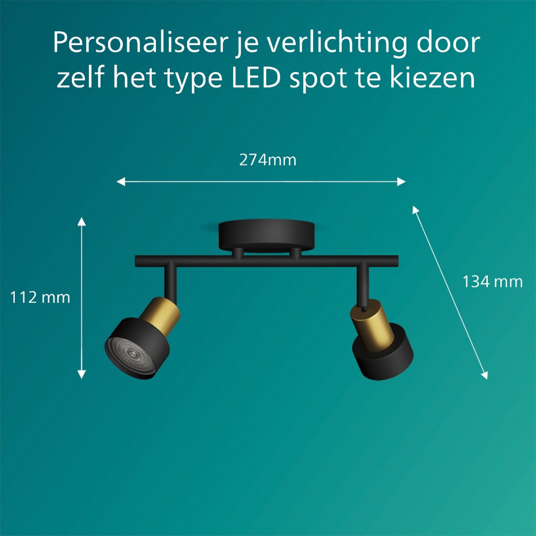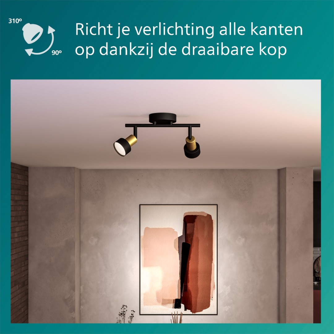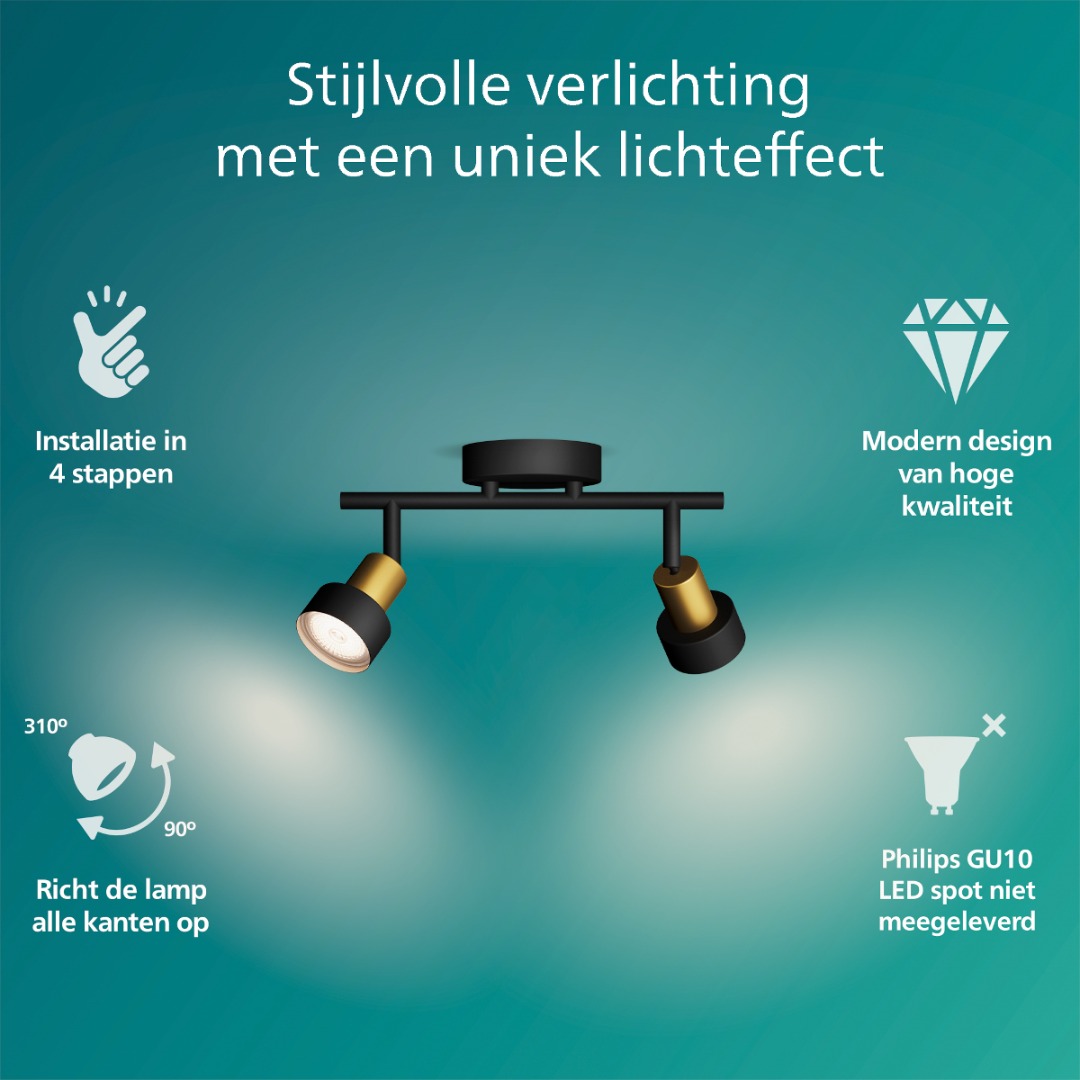 Hoe prachtig is deze Conduit opbouwspot van Philips? De lamp combineert een mooi zwart armatuur, maar gecombineerd met de gouden hals wordt de lamp nog net iets mooier. Erg leuk om te combineren met de andere spots uit de Conduit serie. De spot heeft 2x een GU10 fitting geschikt voor een led lichtbron van ieder max. 5W en deze wordt niet standaard meegeleverd. Spotverlichting is ideaal om in bijvoorbeeld slaap- of woonkamer te plaatsen en kan je vaak in de gewenste richting schijnen om objecten of muren goed uit te lichten en te zorgen voor een mooie lichtverspreiding. Deze Conduit spot is eenvoudig te monteren middels het Philips Click Fix systeem.