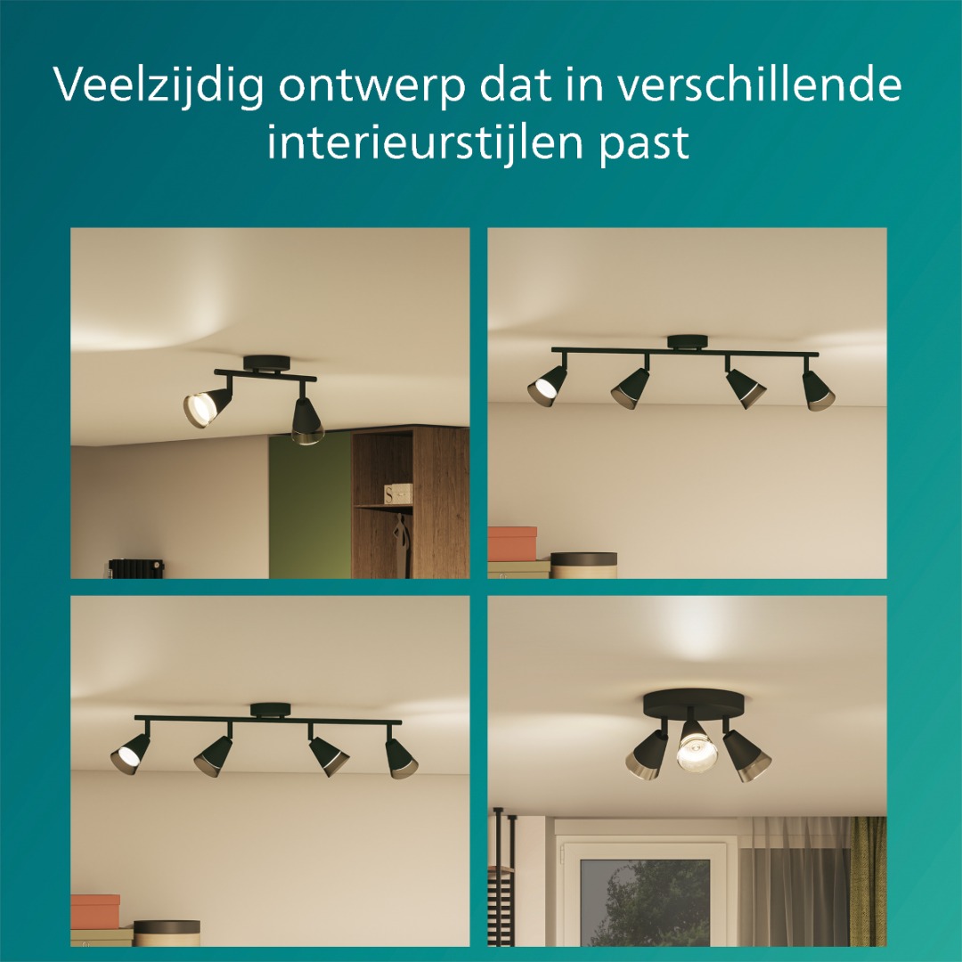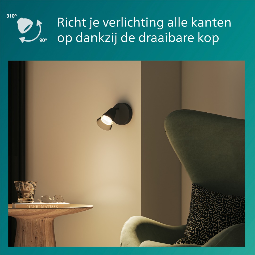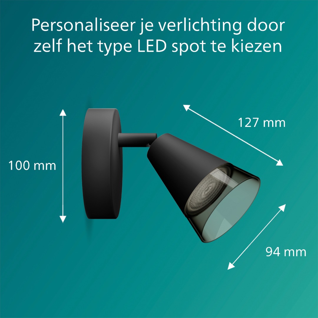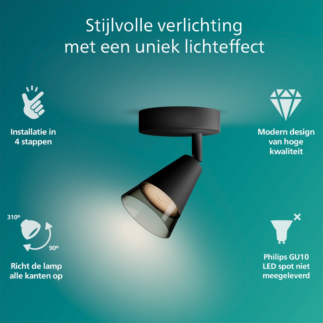 Deze Cleft opbouwspot combineert een zwart armatuur met aan het einde een stuk rookglas en geeft hierdoor prachtig licht af. De lamp past door zijn zwarte kleur eigenlijk bijna wel in elk interieur. Erg leuk om te combineren met de andere spots uit de Cleft serie. De spot heeft een GU10 fitting geschikt voor een led lichtbron van max. 5W en deze wordt niet standaard meegeleverd. Spotverlichting is ideaal om in bijvoorbeeld slaap- of woonkamer te plaatsen en kan je vaak in de gewenste richting schijnen om objecten of muren goed uit te lichten en te zorgen voor een mooie lichtverspreiding. Deze Cleft spot is eenvoudig te monteren middels het Philips Click Fix systeem.