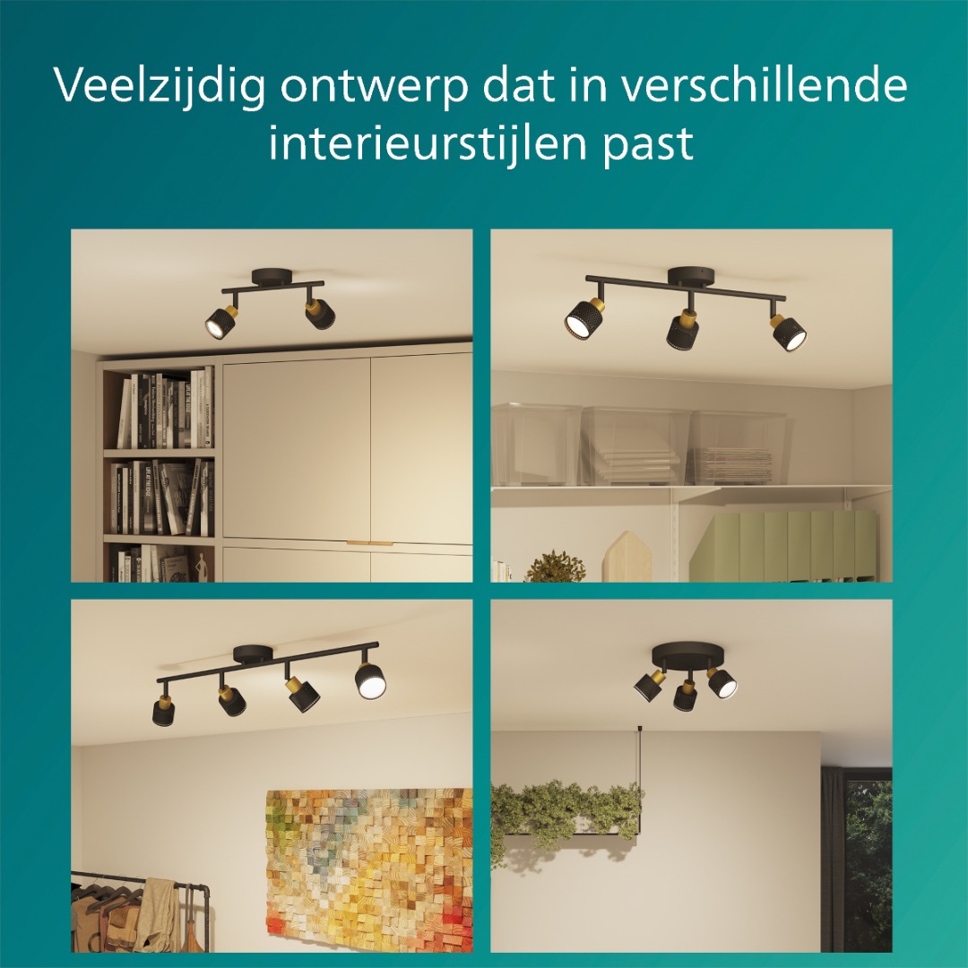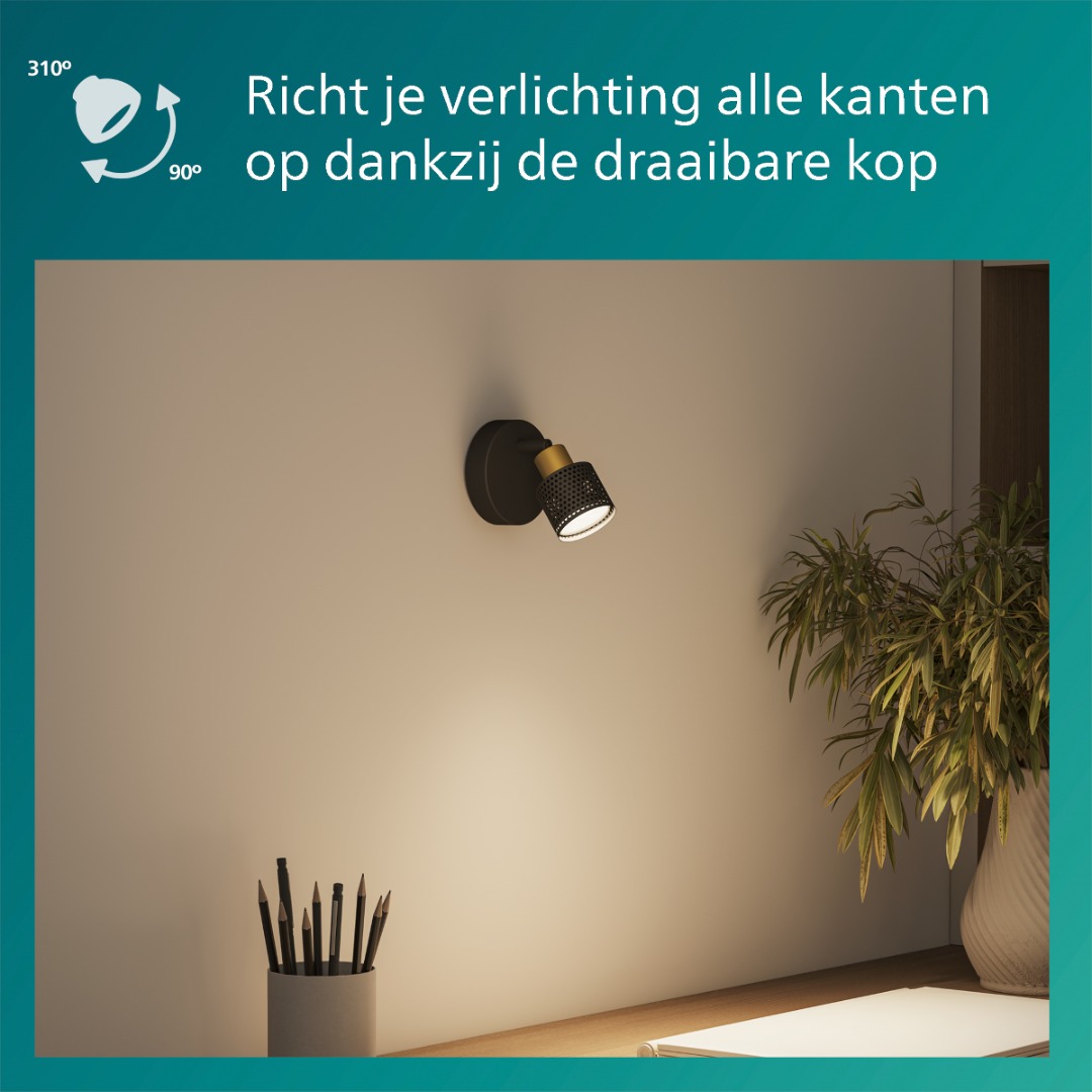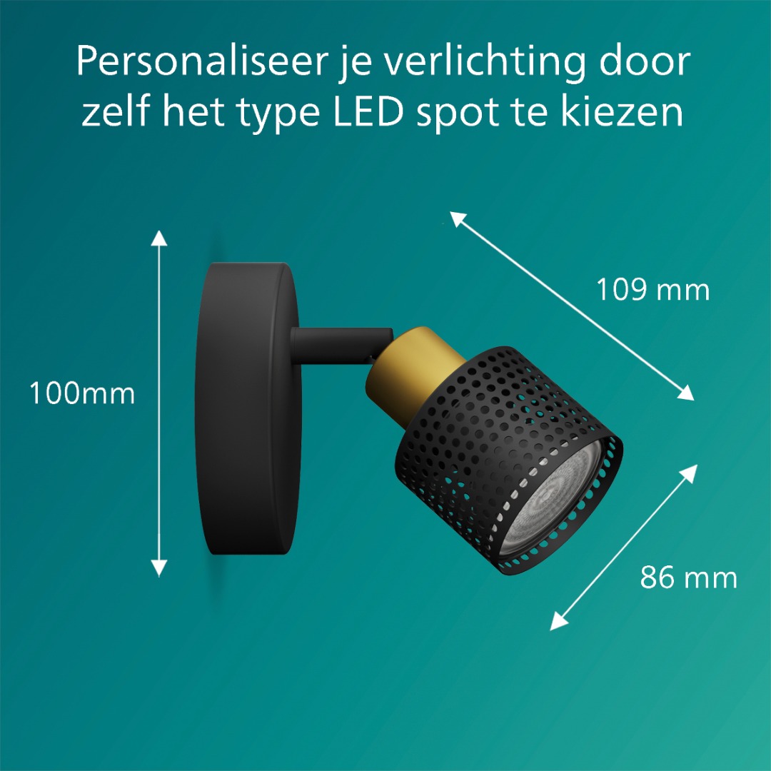 Hoe prachtig is deze Niall opbouwspot van Philips? De lamp heeft een mooi zwart armatuur, maar gecombineerd met de gouden hals wordt de lamp nog net iets mooier. En of deze combi nog niet genoeg is, heeft het kapje van deze spot een leuk rastervormig patroon. Erg leuk om te combineren met de andere spots uit de Niall serie. De spot heeft een GU10 fitting geschikt voor een led lichtbron van max. 5W en deze wordt niet standaard meegeleverd. Spotverlichting is ideaal om in bijvoorbeeld slaap- of woonkamer te plaatsen en kan je vaak in de gewenste richting schijnen om objecten of muren goed uit te lichten en te zorgen voor een mooie lichtverspreiding. Deze Niall spot is eenvoudig te monteren middels het Philips Click Fix systeem.
