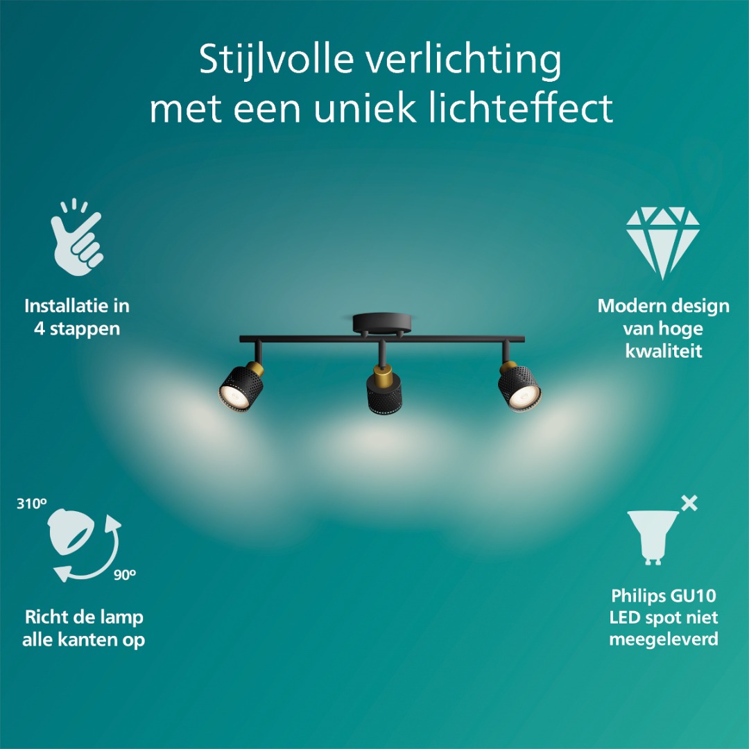 Hoe prachtig is deze Niall opbouwspot van Philips? De lamp heeft een mooi zwart armatuur, maar gecombineerd met de gouden hals wordt de lamp nog net iets mooier. En of deze combi nog niet genoeg is, heeft het kapje van deze spot een leuk rastervormig patroon. Erg leuk om te combineren met de andere spots uit de Niall serie. De spot heeft 3x een GU10 fitting geschikt voor een led lichtbron van max. 5W en deze wordt niet standaard meegeleverd. Spotverlichting is ideaal om in bijvoorbeeld slaap- of woonkamer te plaatsen en kan je vaak in de gewenste richting schijnen om objecten of muren goed uit te lichten en te zorgen voor een mooie lichtverspreiding. Deze Niall spot is eenvoudig te monteren middels het Philips Click Fix systeem.