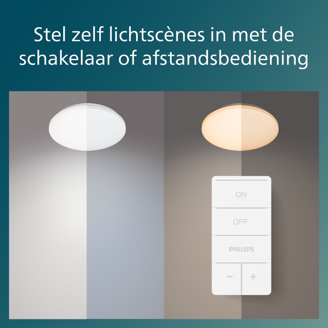 Een moderne, simpele plafondlamp uit de collectie van Philips met tal van mogelijkheden. De lamp bedien je heel eenvoudig met de meegeleverde afstandsbediening (welke je heel makkelijk aan de muur kunt bevestigen met de houder). Zo kan je switchen tussen verschillende lichtkleuren tussen 2700-6500K met de 4 vooraf ingestelde lichtscènes. Ideaal voor als je af en toe sfeerverlichting nodig hebt, maar soms ook meer licht als je moet werken of concentereren. Maar ook dimmen gaat eenvoudig met de afstandsbediening (let op, werkt niet in combinatie met een wanddimmer). Kortom een ideale lamp die simplistisch lijkt, maar wel genoeg mogelijkheden biedt.