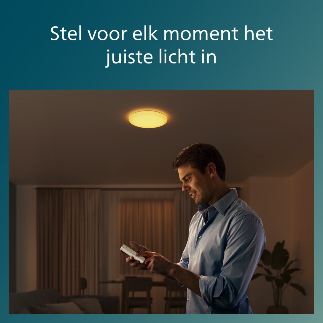 Een moderne, simpele plafondlamp uit de collectie van Philips met tal van mogelijkheden. De lamp bedien je heel eenvoudig met de meegeleverde afstandsbediening (welke je heel makkelijk aan de muur kunt bevestigen met de houder). Zo kan je switchen tussen verschillende lichtkleuren tussen 2700-6500K met de 4 vooraf ingestelde lichtscènes. Ideaal voor als je af en toe sfeerverlichting nodig hebt, maar soms ook meer licht als je moet werken of concentereren. Maar ook dimmen gaat eenvoudig met de afstandsbediening (let op, werkt niet in combinatie met een wanddimmer). Kortom een ideale lamp die simplistisch lijkt, maar wel genoeg mogelijkheden biedt.