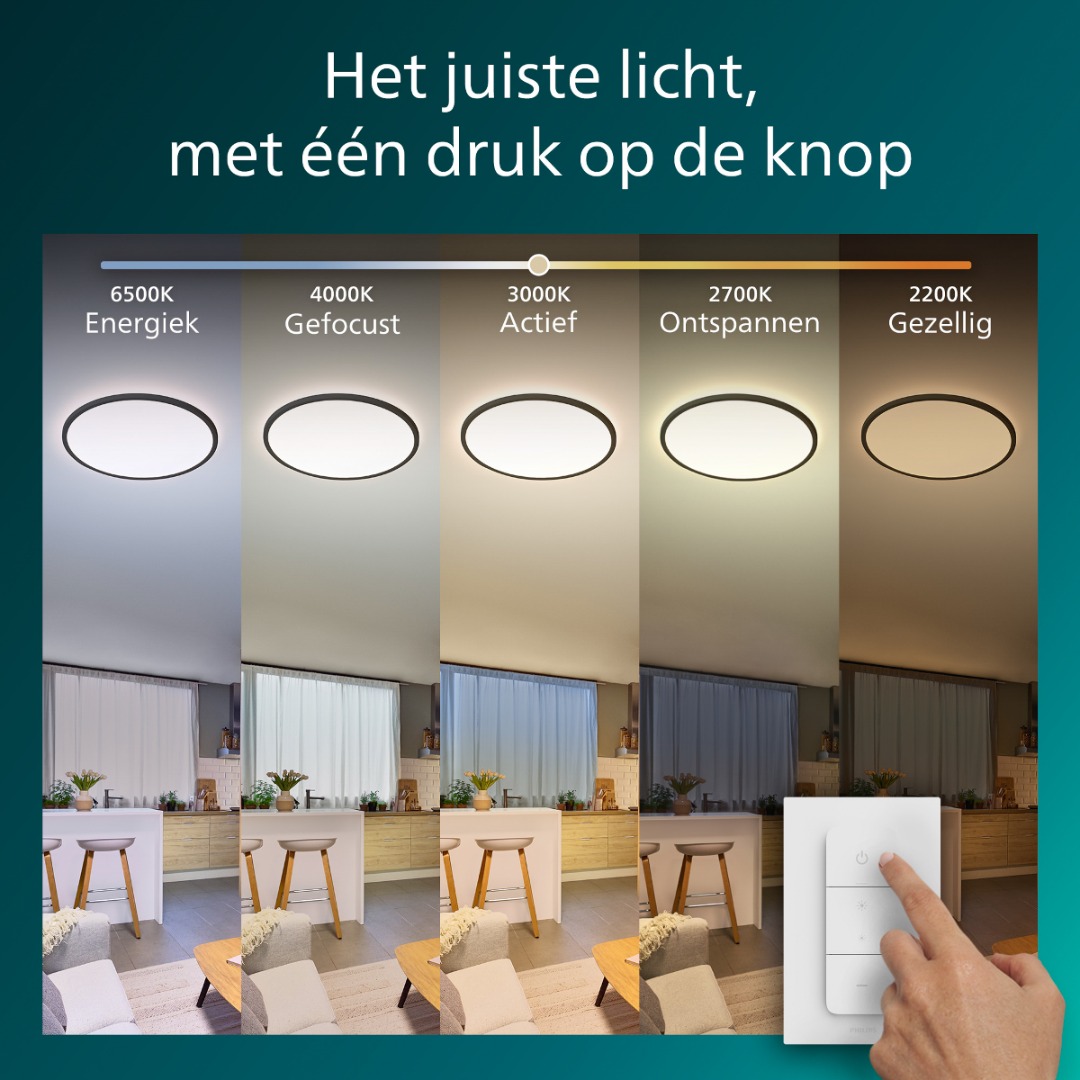 Een moderne plafondlamp ideaal geschikt voor als je weinig ruimte hebt. Met een hoogte van maar 2,4 cm is deze lamp niet alleen prachtig om te zien, maar ook nog eens handig in gebruik. Deze Super Slim plafondlamp bedien jeenvoudig met de meegeleverde afstandsbediening waarmee je kan switchen van warm, sfeervol ligt van 2200K, naar andere lichtkleuren 2700K/3000K/4000K en uiteindelijk energiek koel daglicht van 6500K. Kortom de juiste lichtkleur voor het juiste moment van de dag. Of dat nog niet genoeg is kan je binnen elke lichtkleur ook nog eens het licht dimmen. De plafondlamp heeft een zwarte rand en komt op veel plaatsen in je interieur goed tot zijn recht. Let op! Deze lamp is niet geschikt om te combineren met een wanddimmer.