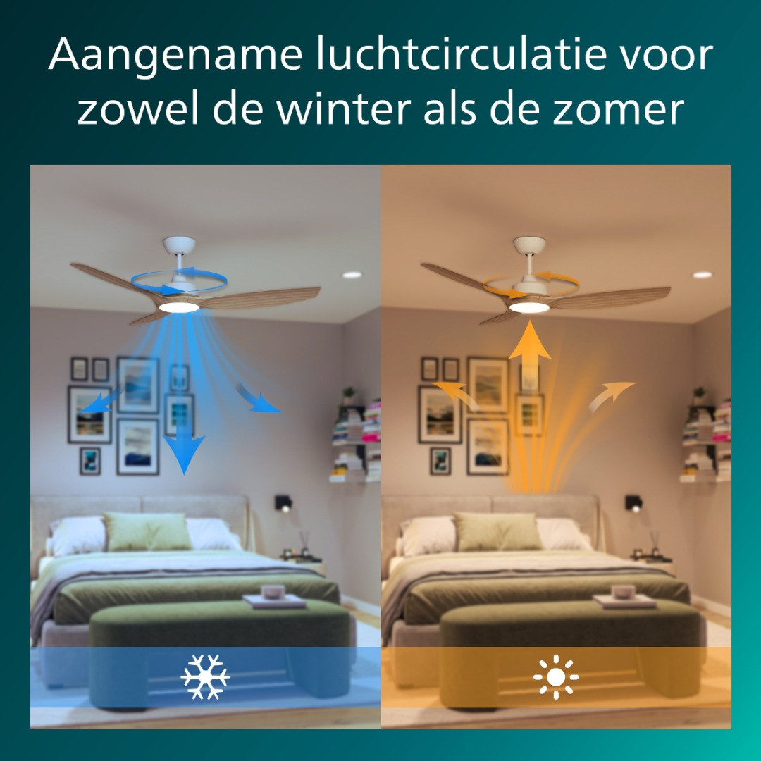 Een moderne plafondventilator met licht van de Philips Olas collectie. De lamp heeft een witte kleur afgewerkt met een mooie houtkleur past daardoor bijna in elk interieur. De ventilatorlamp heeft een aangename luchtcirculatie voor zowel de zomer als winter. Daarnaast kan je de lichtkleur instellen van 3000K - 4300K - 6000K. Zo pas je het licht naar wens aan voor het juiste moment. De lamp en ventilator kan je beiden aan-/ en uitzetten en hierdoor afzonderlijk van elkaar gebruiken. Ook zijn er verschillende snelheden en timers. Dat alles stel je eenvoudig in met de meegeleverde afstandsbediening. Het betreft hier de grotere variant. Deze ventilator is ook beschikbaar in een kleinere variant van 106 cm diameter.