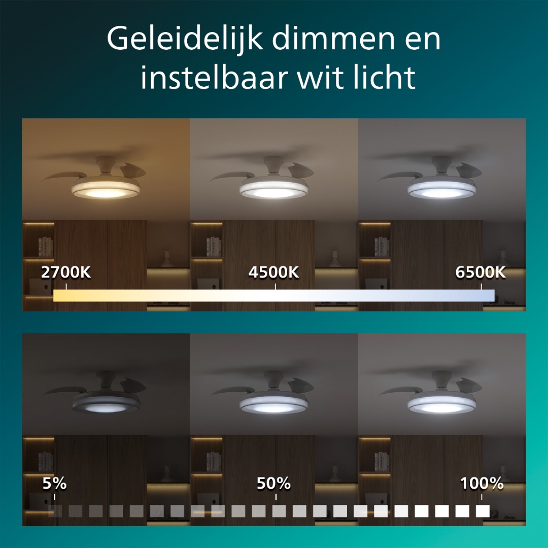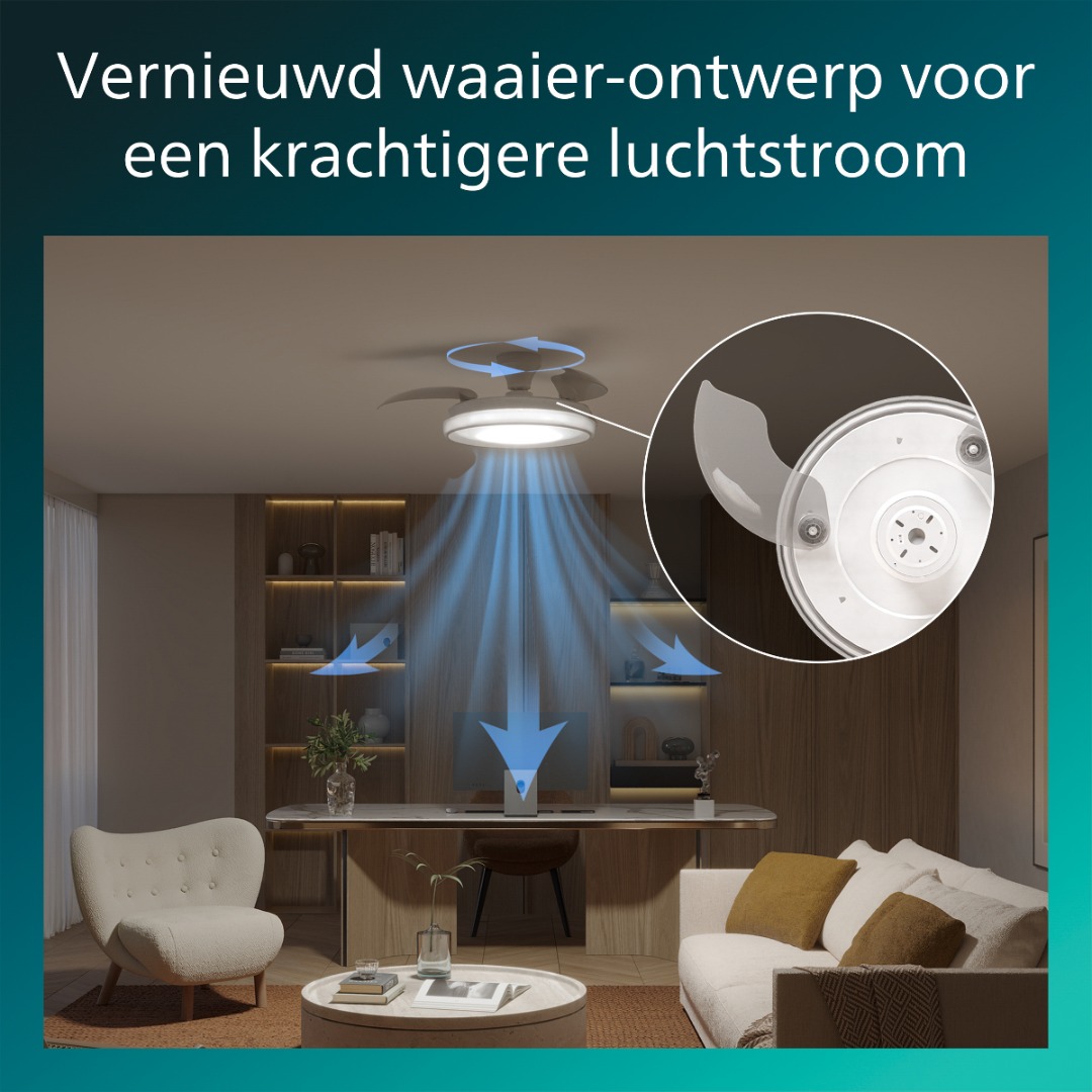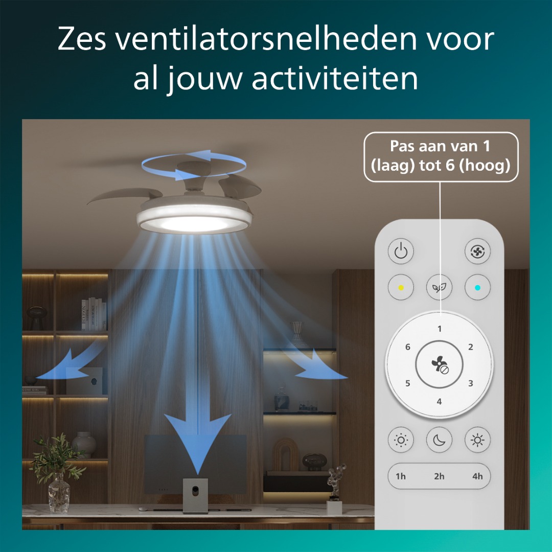 Een plafondventilator is ideaal om zowel de ruimte te verlichten als te genieten van een koel briesje op de warme dagen. Met deze Bliss ventilatorlamp geniet je van de vele mogelijkheden zoals 6 ventilatorsnelheden, instelbaar licht van 2700K/4500K of 6500K, timer, nachtlampfunctie en dimmen. Dat alles bedien je eenvoudig met de meegeleverde afstandsbediening. Daarnaast heeft deze ventilatorlamp ook een zomer- en winterstand. In de zomerstand blaast hij koude lucht naar beneden en in de winter zorgt hij ervoor dat de warme lucht blijft circuleren. De bladen van deze ventilatorlamp zijn ook nog eens inklapbaar, dus als je de ventilator niet nodig hebt, kan je de bladen inklappen voor een compacter model. Het witte design zorgt ervoor dat de ventilatorlamp in veel interieurstijlen tot zijn recht komt.