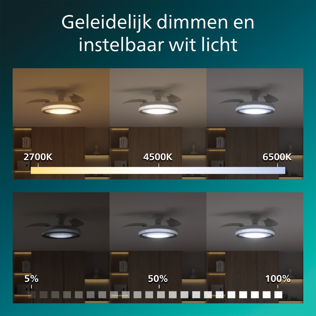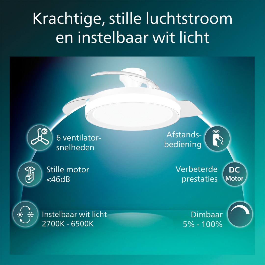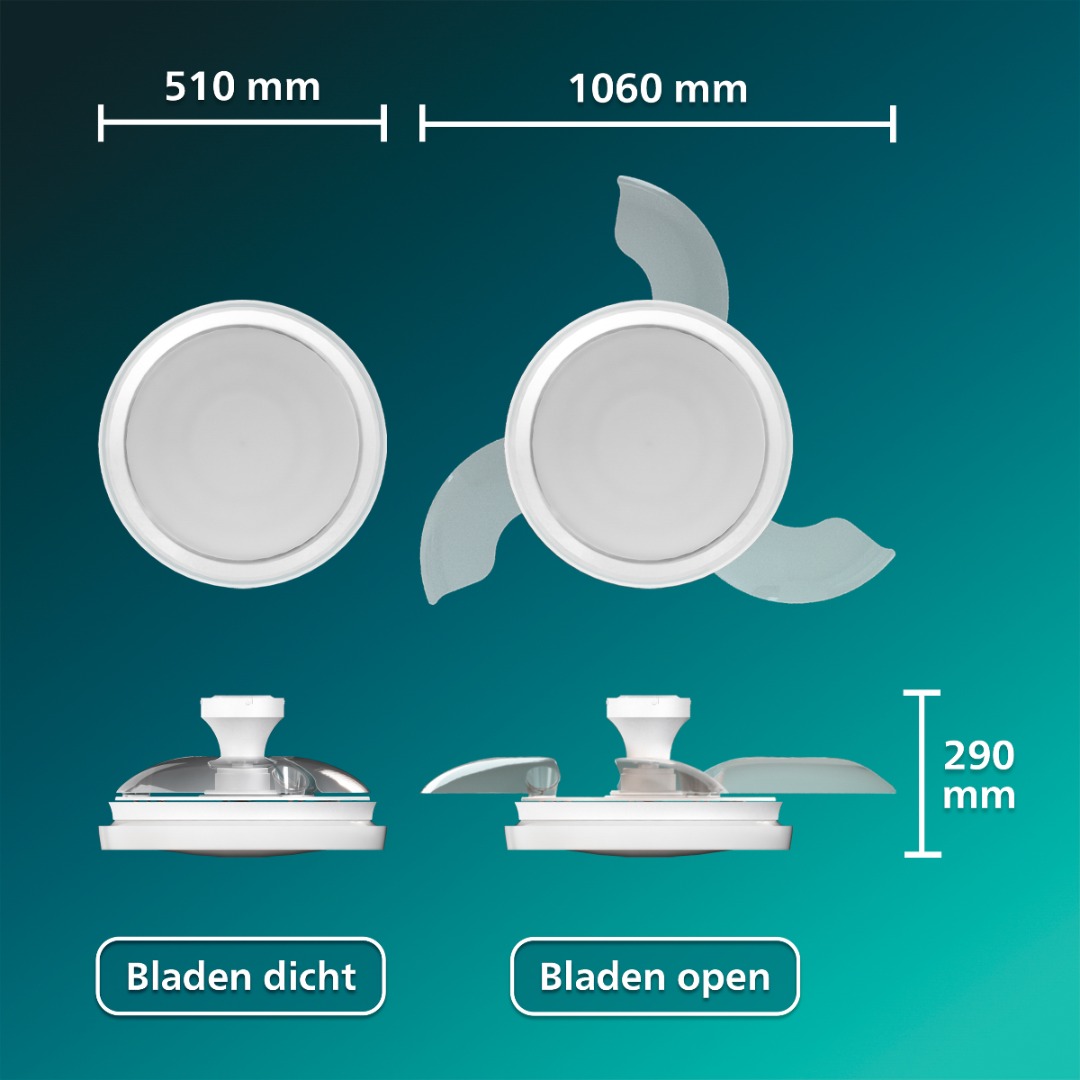 Een plafondventilator is ideaal om zowel de ruimte te verlichten als te genieten van een koel briesje op de warme dagen. Met deze Bliss ventilatorlamp geniet je van de vele mogelijkheden zoals 6 ventilatorsnelheden, instelbaar licht van 2700K/4500K of 6500K, timer, nachtlampfunctie en dimmen. Dat alles bedien je eenvoudig met de meegeleverde afstandsbediening. Daarnaast heeft deze ventilatorlamp ook een zomer- en winterstand. In de zomerstand blaast hij koude lucht naar beneden en in de winter zorgt hij ervoor dat de warme lucht blijft circuleren. De bladen van deze ventilatorlamp zijn ook nog eens inklapbaar, dus als je de ventilator niet nodig hebt, kan je de bladen inklappen voor een compacter model. Het witte design afgemaakt met houten details zorgt ervoor dat de ventilatorlamp in veel interieurstijlen tot zijn recht komt. Het leuke aan deze ventilator is dat de lamp een soort glinstereffect heeft en daardoor net een beetje extra is dan de normale Bliss.