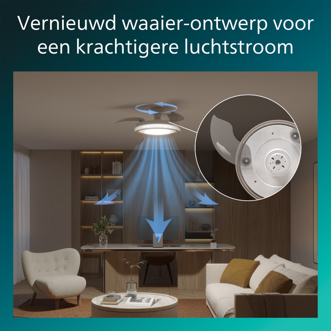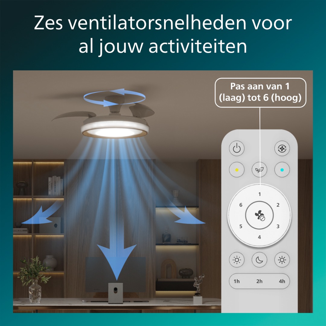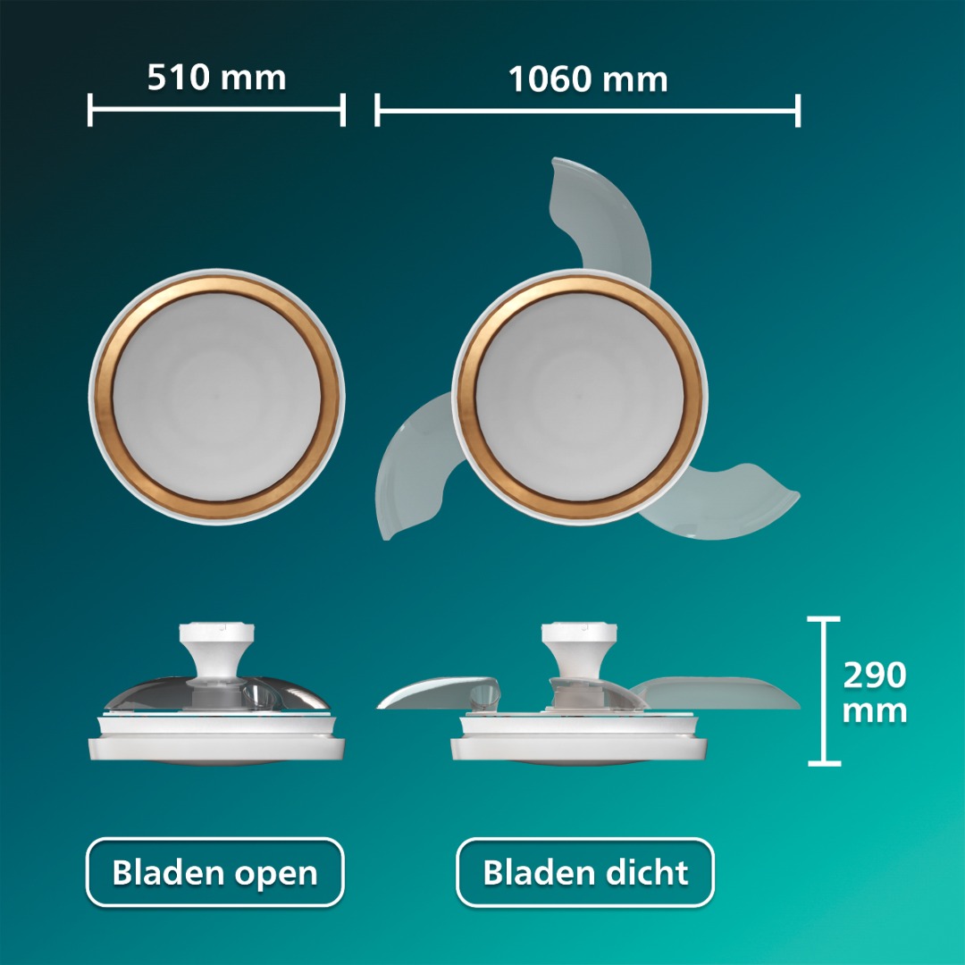 Een plafondventilator is ideaal om zowel de ruimte te verlichten als te genieten van een koel briesje op de warme dagen. Met deze Bliss ventilatorlamp geniet je van de vele mogelijkheden zoals 6 ventilatorsnelheden, instelbaar licht van 2700K/4500K of 6500K, timer, nachtlampfunctie en dimmen. Dat alles bedien je eenvoudig met de meegeleverde afstandsbediening. Daarnaast heeft deze ventilatorlamp ook een zomer- en winterstand. In de zomerstand blaast hij koude lucht naar beneden en in de winter zorgt hij ervoor dat de warme lucht blijft circuleren. De bladen van deze ventilatorlamp zijn ook nog eens inklapbaar, dus als je de ventilator niet nodig hebt, kan je de bladen inklappen voor een compacter model. Het witte design afgemaakt met een gouden ring zorgt ervoor dat de ventilatorlamp in veel interieurstijlen tot zijn recht komt.