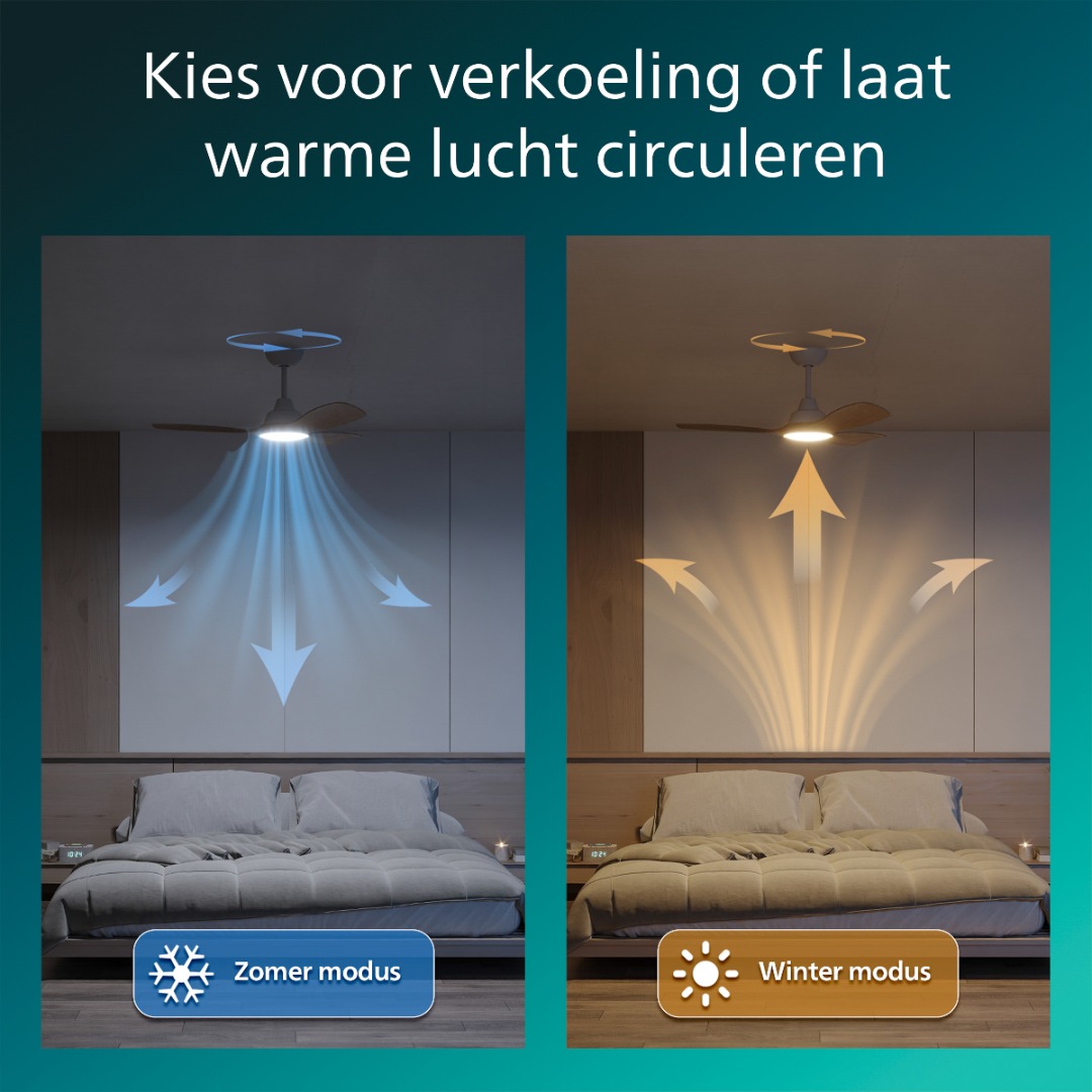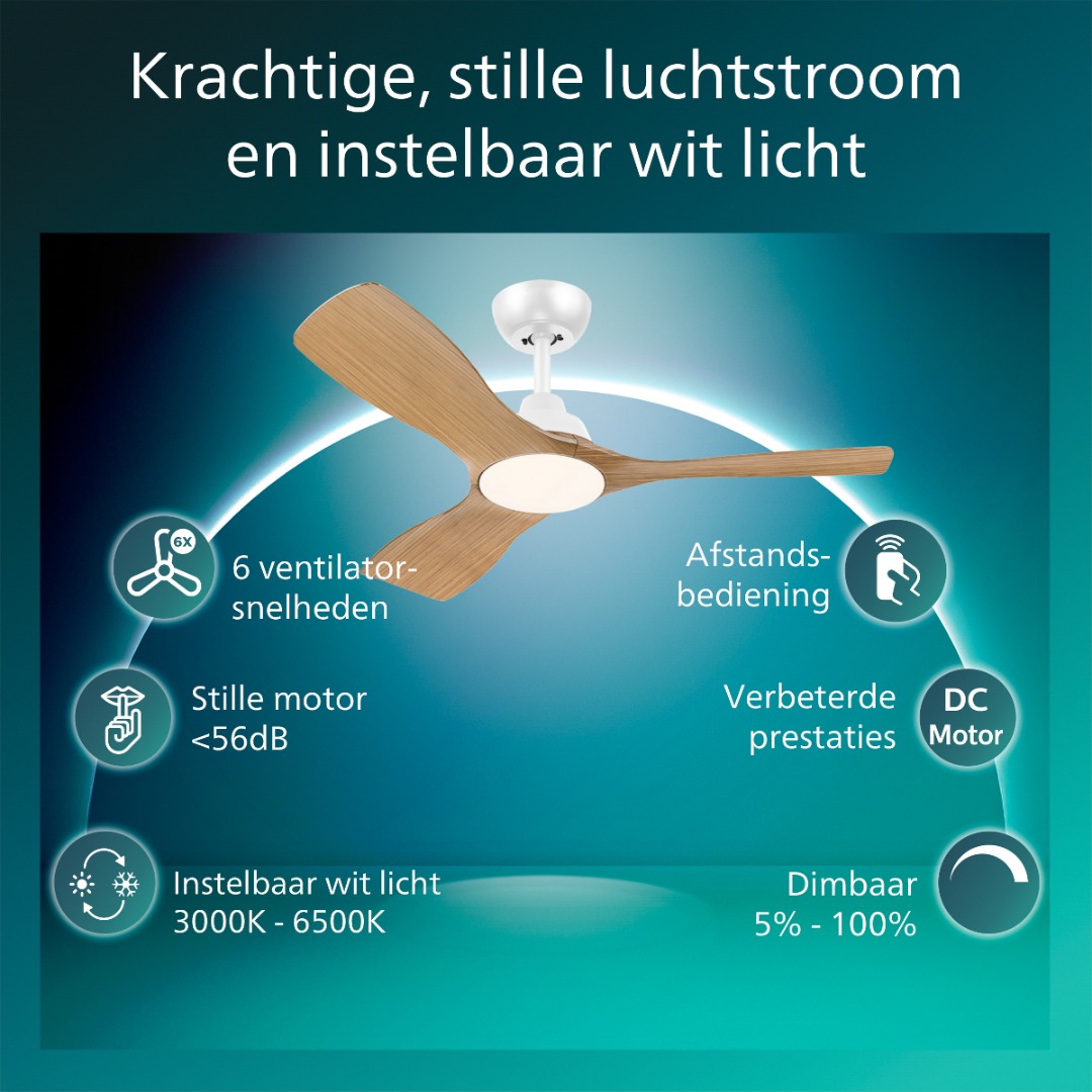 Een plafondventilator is ideaal om zowel de ruimte te verlichten als te genieten van een koel briesje op de warme dagen. Met deze Olas ventilatorlamp geniet je van de vele mogelijkheden zoals 6 ventilatorsnelheden, instelbaar licht van 3000K/4500K of 6500K, timer, nachtlampfunctie en dimmen. Dat alles bedien je eenvoudig met de meegeleverde afstandsbediening. Daarnaast heeft deze ventilatorlamp ook een zomer- en winterstand. In de zomerstand blaast hij koude lucht naar beneden en in de winter zorgt hij ervoor dat de warme lucht blijft circuleren. Het witte, tijdloze design afgemaakt met hout zorgt ervoor dat de ventilatorlamp in veel interieurstijlen tot zijn recht komt.