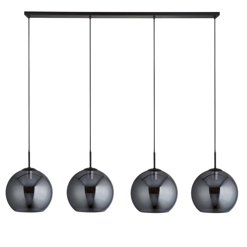 Een 4-lichts hanglamp met een moderne look uit de collectie Amsterdam van het merk Searchlight. De lamp is gemaakt van staal en rookglas en heeft een geheel mat zwarte kleur. De lamp wordt geleverd exclusief lichtbronnen met E27 fittingen geschikt voor max. 60 watt per lichtbol. De lamp kan goed geplaatst worden in de eetkamer boven de eettafel of boven het keukeneiland. De lamp is bij installatie in hoogte verstelbaar.
