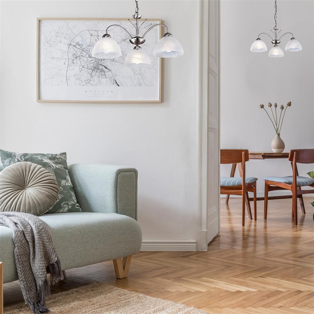Een prachtige 3-lichts hanglamp uit de Milanese collectie van het merk Searchlight met een klassieke uitstraling. De lamp heeft een zilveren kleur en drie albasten glazen kapjes. De lamp wordt geleverd exclusief lichtbronnen met E14 fitting geschikt voor max. 3x 60 watt. De lamp kan mooi geplaatst worden in bijvoorbeeld de hal, woonkamer of boven de eettafel. In hoogte te verstellen bij installatie.