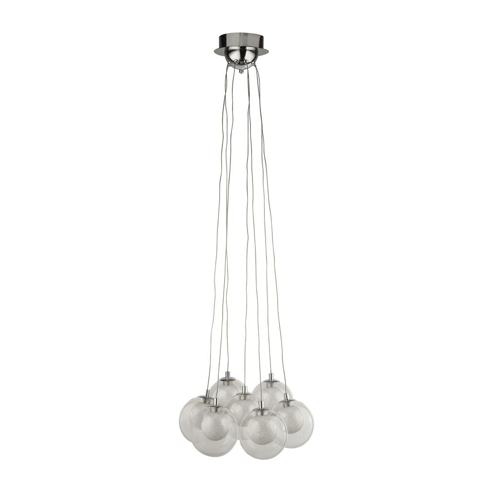 Een moderne 7-lichts hanglamp uit de collectie Cluster van het merk Searchlight. De lamp is gemaakt van metaal en glas. De glazen bollen hebben elk een nog kleiner kristallen glazen bolletje van binnen. De lamp is inclusief LED lichtbronnen van 17 watt in totaal. De lamp is in hoogte verstelbaar bij installatie. Mooi boven de eettafel of in een ruime hal als blikvanger bij binnenkomst.