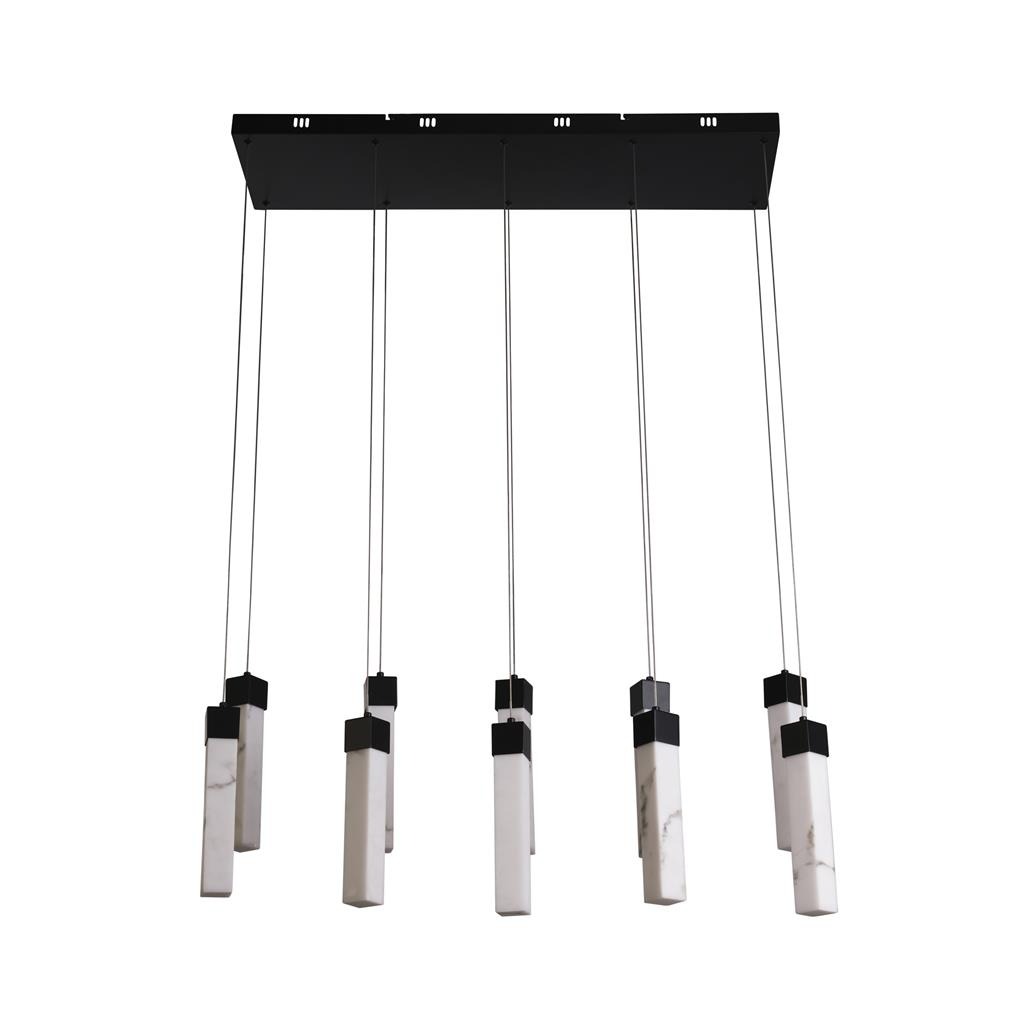 Een opvallende lamp uit de Moonbeam collectie van het merk Searchlight. Deze LED-hanglamp heeft een elegante klassieke uitstraling en verrijkt moeiteloos elke ruimte. De lamp heeft een ''marmer'' effect en de zwarte metalen accenten zorgen voor een design dat direct indruk maakt. Goed toepasselijk boven bijvoorbeeld het keukeneiland of de eettafel. De lamp wordt geleverd met maar liefst 10 geïntegreerde LED lichtbronnen van 56 watt in totaal. Bij installatie is de lamp in hoogte te verstellen tot maximaal 150 cm.