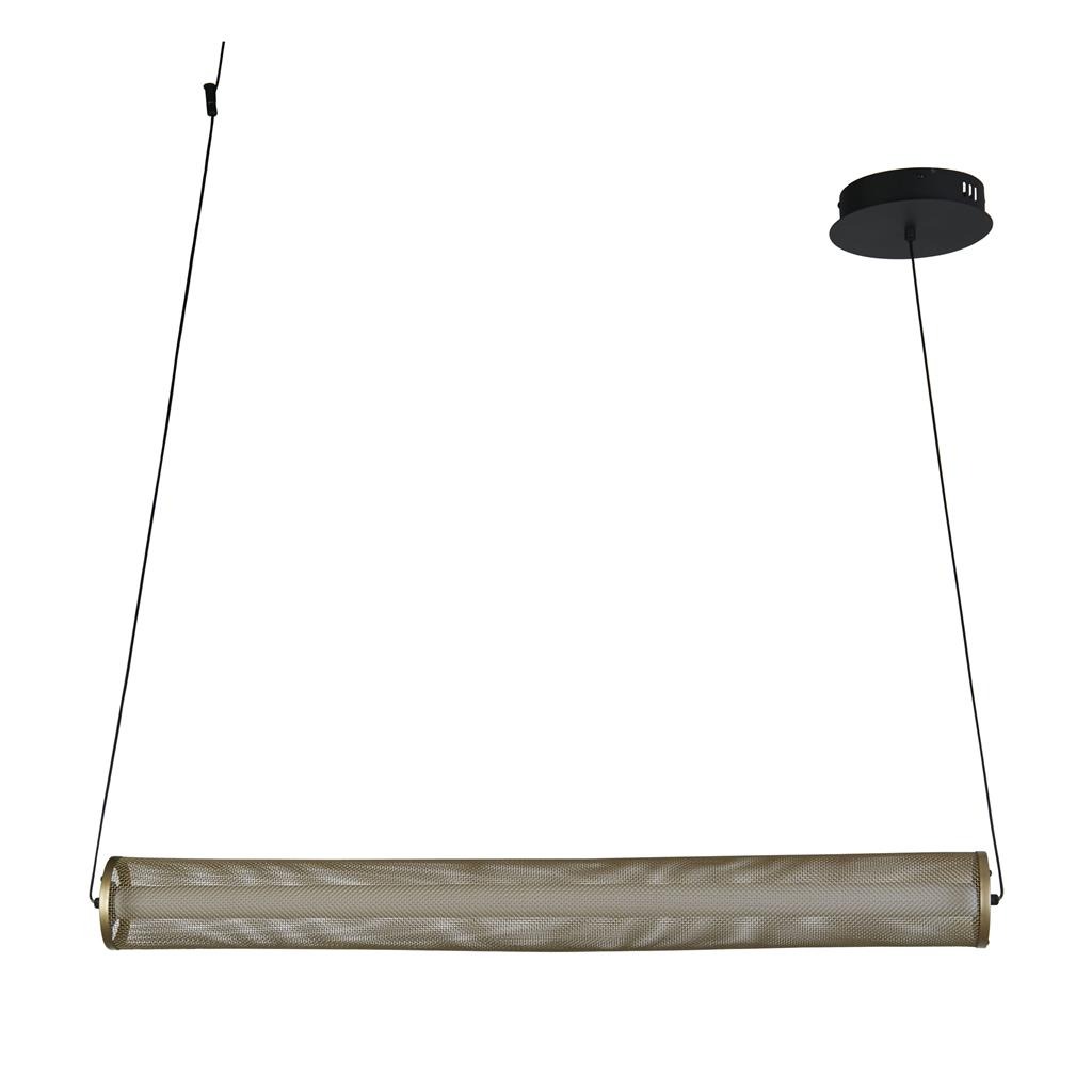 Een bijzondere lamp uit de Thread collectie van het merk Searchlight. De hanglamp valt op door zijn moderne uitstraling met industriële accenten. Het flexibele ontwerp maakt het mogelijk de lamp zowel liggend als staand te monteren. De combinatie van een matzwarte metalen plafondbevestiging en een elegante goudkleurige mesh kap geeft de lamp een luxe uitstraling. Deze lamp is perfect in verschillende ruimtes. De lamp wordt geleverd inclusief LED lichtbron van 26 watt. De lamp is bij installatie in hoogte te verstellen. Dimbaar in 3 stappen middels de wandschakelaar.