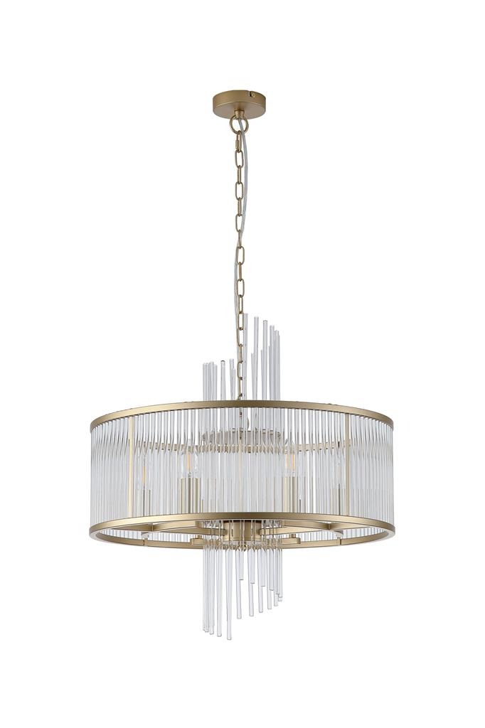 Een klassieke hanglamp uit de Lara collectie van het merk Searchlight. De lamp is een stijlvolle blikvanger die elke ruimte verrijkt met een gevoel van luxe en klasse. Fijne glazen staafjes en een subtiele goudkleurige band die het ontwerp samenbrengt en het warme licht prachtig weerspiegelt. Dankzij de zachte sfeervolle uitstraling is deze hanglamp ideaal voor chique interieurs. Toepasselijk in kamers zoals in de hal, slaap-, woon-, of eetkamer boven de eetttafel. De Lara hanglamp tilt de ruimte moeiteloos naar een hoger niveau. Stijlvol te combineren met de rest van de lampen uit de gelijknamige serie. De lamp is exclusief lichtbron en geschikt voor 6x 60W en E14 fitting. In hoogte te vestellen naar wens bij installatie.