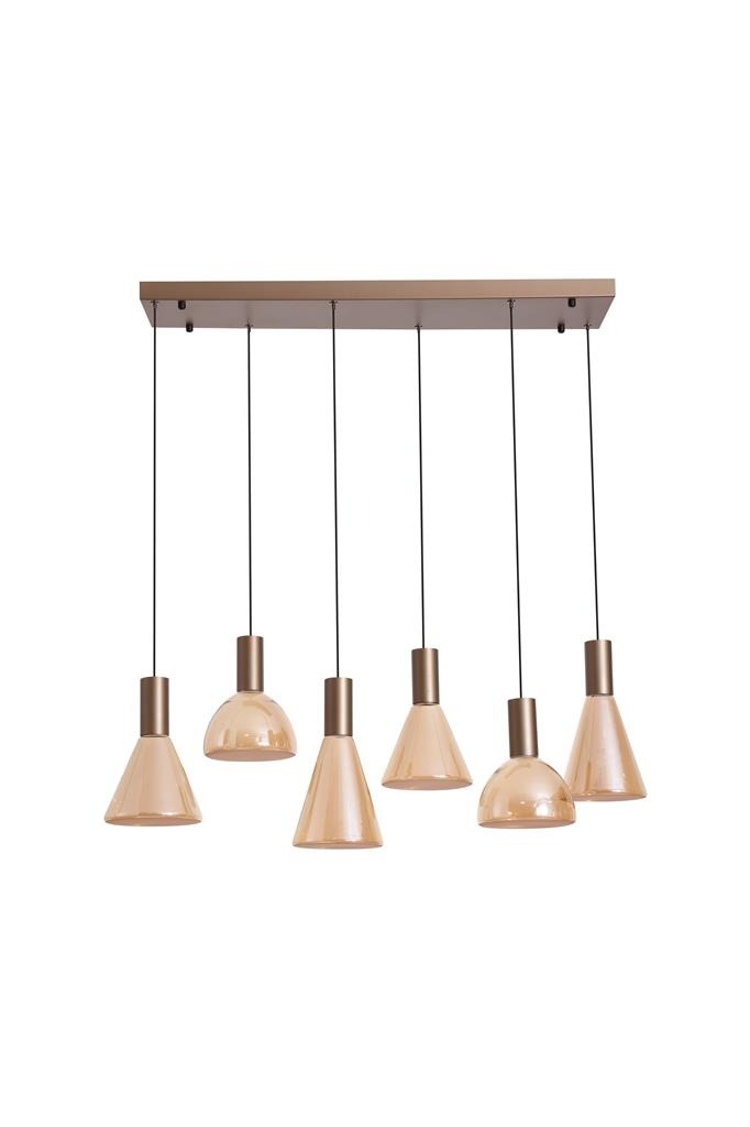 Een hanglamp uit de Cannes collectie van het merk Searchlight. Deze moderne hanglamp combineert een strak ontwerp met functionele verlichting. De lamp heeft de trendy Searchlight kleur: Latte. Dit is een metallic bruinachtige koffie kleur. De amberkleurige glazen kappen passen perfect bij de warme latte-kleurige metalen plafondplaat en fittingen. De zes hangende lampen wisselen tussen amberkleurige glazen kappen in kegel- en koepelvorm, wat zorgt voor een speels maar harmonieus geheel. Dankzij de verstelbare ophanging pas je de hoogte eenvoudig aan jouw ruimte en plafond aan. De lamp is inclusief LED lichtbronnen van 42W totaal.