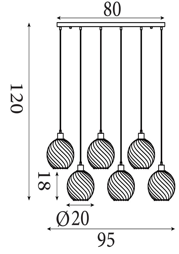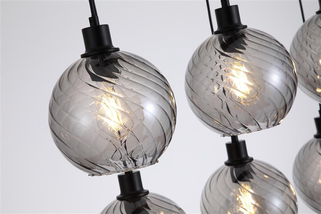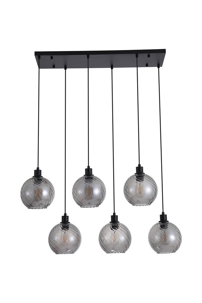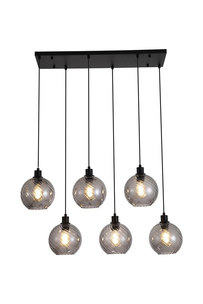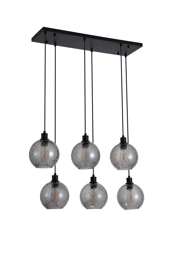 Een lamp uit de Radiance collectie van het merk Searchlight. De hanglamp is voorzien van zes rookglazen bolkappen met een subtiel gedraaid patroon dat zorgt voor extra textuur en diepte. De lampen hangen in een strakke opstelling aan een zwartkleurige plafondplaat. De rookglazen in combinatie met de zwartkleurige details geeft de lamp een moderne en luxe uitstraling. Dankzij het langwerpige ontwerp is deze hanglamp ideaal voor grotere ruimtes zoals boven een eettafel, kookeiland of ontbijtbar. De lamp is exclusief lichtbronnen en is geschikt voor maximaal 6x 60W en E27 fitting.