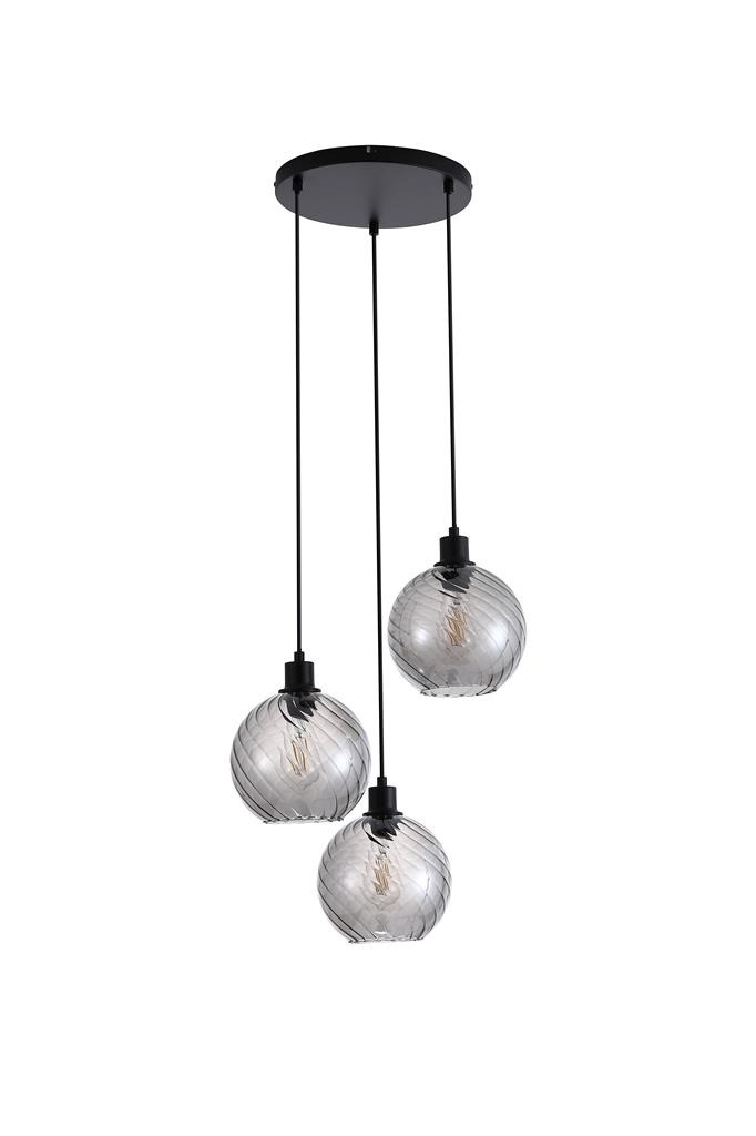 Een lamp uit de Radiance collectie van het merk Searchlight. De hanglamp is voorzien van drie rookglazen bolkappen met een subtiel gedraaid patroon dat zorgt voor extra textuur en diepte. De lampen hangen in een strakke opstelling aan een zwartkleurige plafondplaat. De rookglazen in combinatie met de zwartkleurige details geeft de lamp een moderne en luxe uitstraling. De lamp is exclusief lichtbronnen en is geschikt voor maximaal 3x 60W en E27 fitting.
