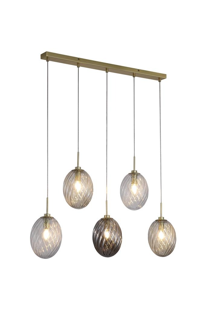 Een lamp uit de Whirl collectie van het merk Searchlight. De Whirl hanglamp heeft vijf gedraaide glazen bollen in heldere, rook- en champagnekleurige afwerkingen gecombineerd met een messing armatuur. Het glas zorgt voor een warme en sfeervolle verlichting. Deze lamp is ideaal voor boven de eettafel of in een open ruimte en geeft het interieur een luxe uitstraling. De lamp is exclusief lichtbronnen en is geschikt voor 5x maximaal 60W en E14 fitting.