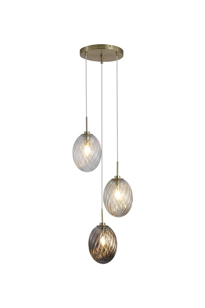 Een lamp uit de Whirl collectie van het merk Searchlight. De Whirl hanglamp heeft drie gedraaide glazen bollen in heldere, rook- en champagnekleurige afwerkingen gecombineerd met een messing armatuur. Het glas zorgt voor een warme en sfeervolle verlichting. Deze lamp is ideaal voor boven de eettafel, in een hal of de slaap-/woonkamer. De lamp geeft waar dan ook het interieur een luxe uitstraling. De lamp is exclusief lichtbronnen en is geschikt voor 3x maximaal 60W en E14 fitting.