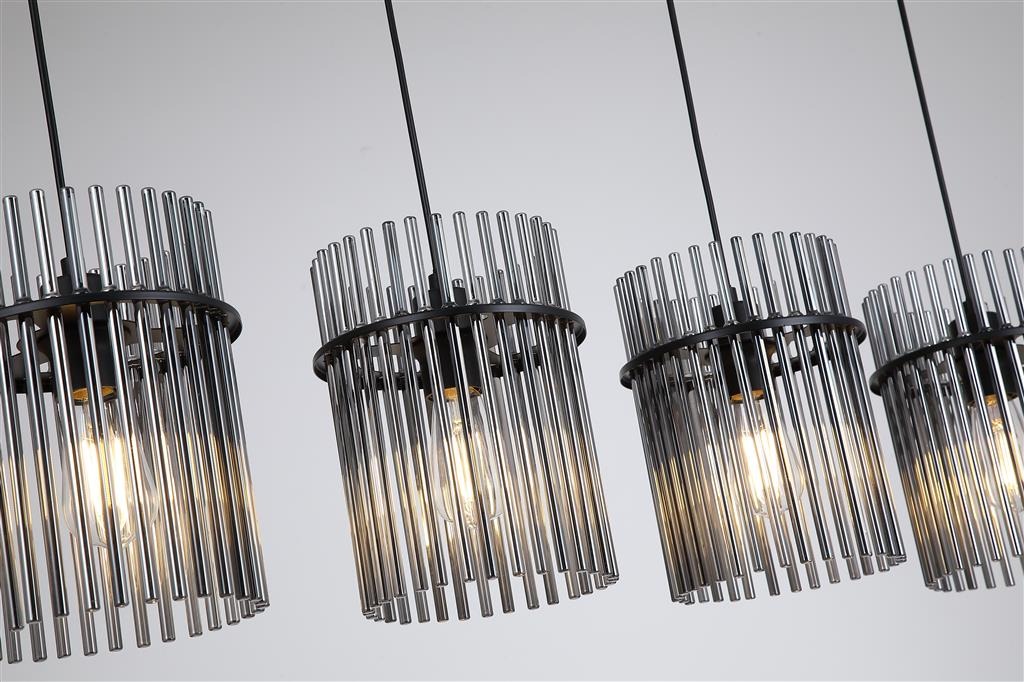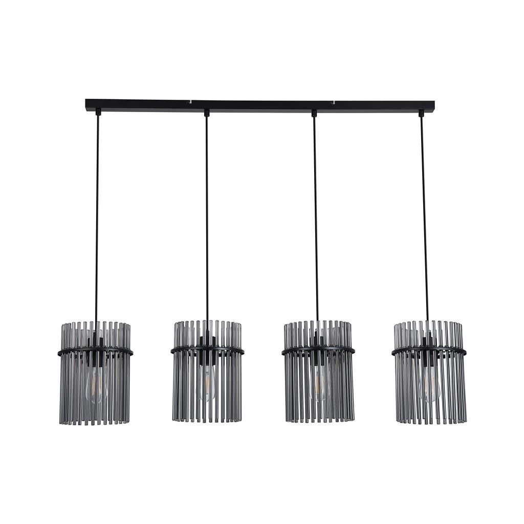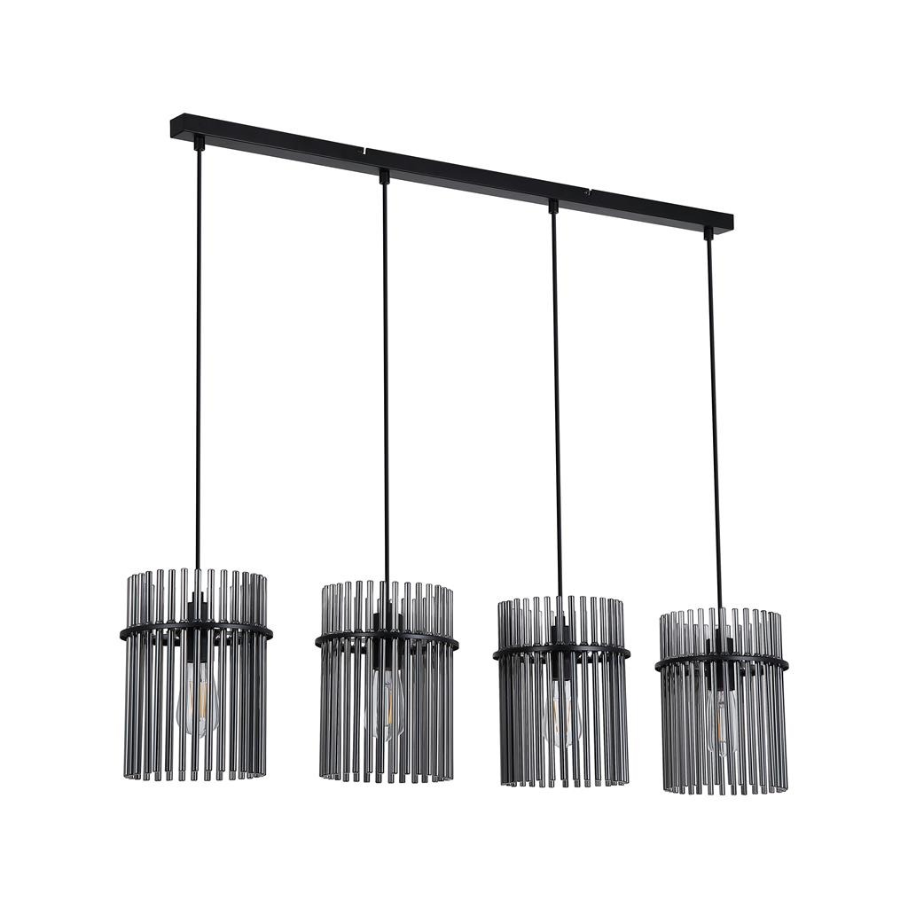 Een 4-lichts hanglamp uit de Swizzle collectie van het merk Searchlight. Breng stijl en sfeer in je huis met de moderne lamp die kunst en licht op een mooie manier samenbrengt. De lamp bestaat uit een bijzondere opstelling van 4 zwarte gerookte glazen staven die er mooi uitzien of de lamp nu aan of uit is. Als je de lamp aanzet verschijnt er een zachte lichtkring rondom het glas. Het licht en de glazen staven zorgen samen voor een interessant schaduwspel dat extra sfeer geeft. De hanglamp is ideaal voor moderne eetkamers, strakke keukens of andere plekken waar je een lamp wilt die niet alleen licht geeft maar ook mooi staat als decoratie. De lamp komt exclusief lichtbron en is geschikt voor E27 fitting en maximaal 4x 60 watt.