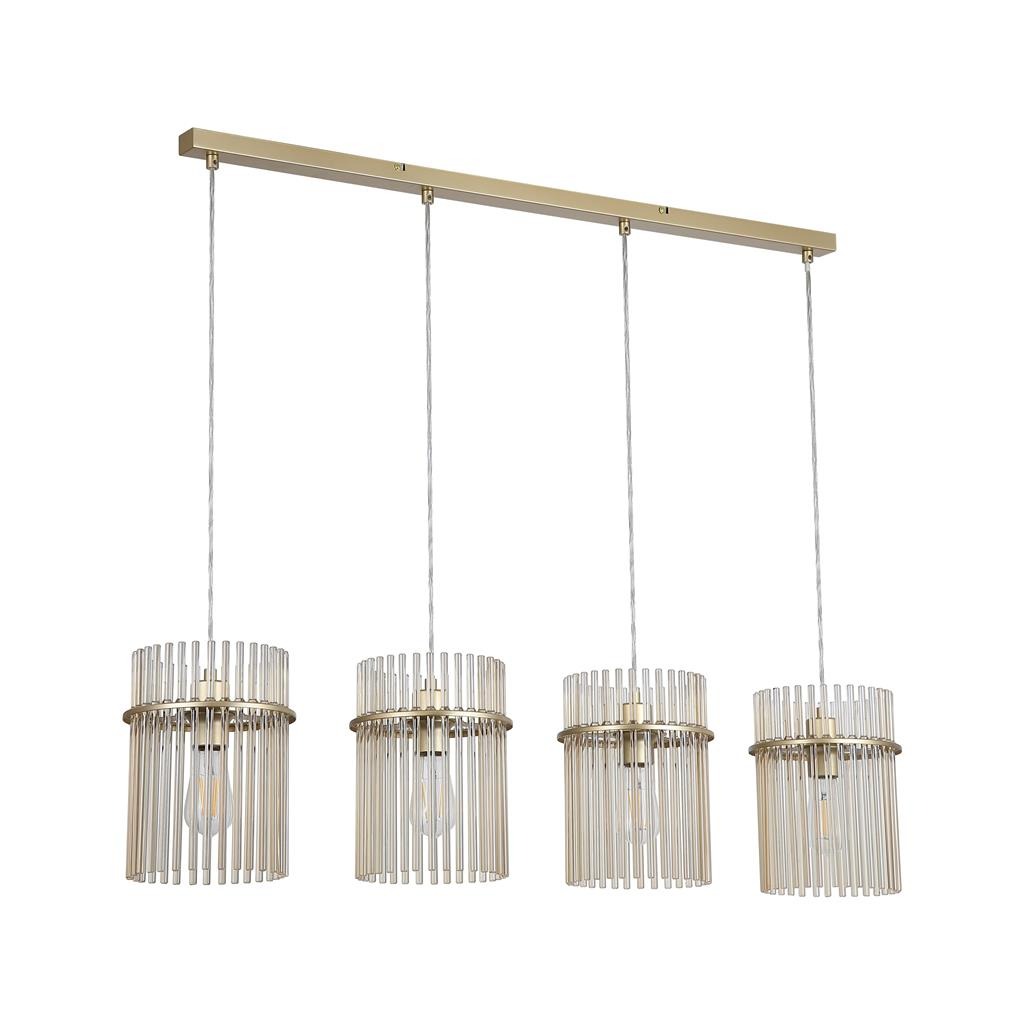 Een lamp uit de Swizzle collectie van het merk Searchlight. Breng stijl en sfeer in je huis met de moderne lamp die kunst en licht op een mooie manier samenbrengt. De lamp heeft een goudkleurige basis met champagnekleurige glazen staven die er mooi uitzien of de lamp nu aan of uit is. Als je de lamp aanzet verschijnt er een zachte lichtkring rondom het glas. Het licht en de glazen staven zorgen samen voor een interessant schaduwspel dat extra sfeer geeft. De hanglamp is ideaal voor moderne eetkamers, boven een keukeiland of andere plekken waar je een lamp wilt die niet alleen licht geeft maar ook mooi staat als decoratie. De lamp komt exclusief lichtbron en is geschikt voor E27 fitting en maximaal 4x 60 watt.