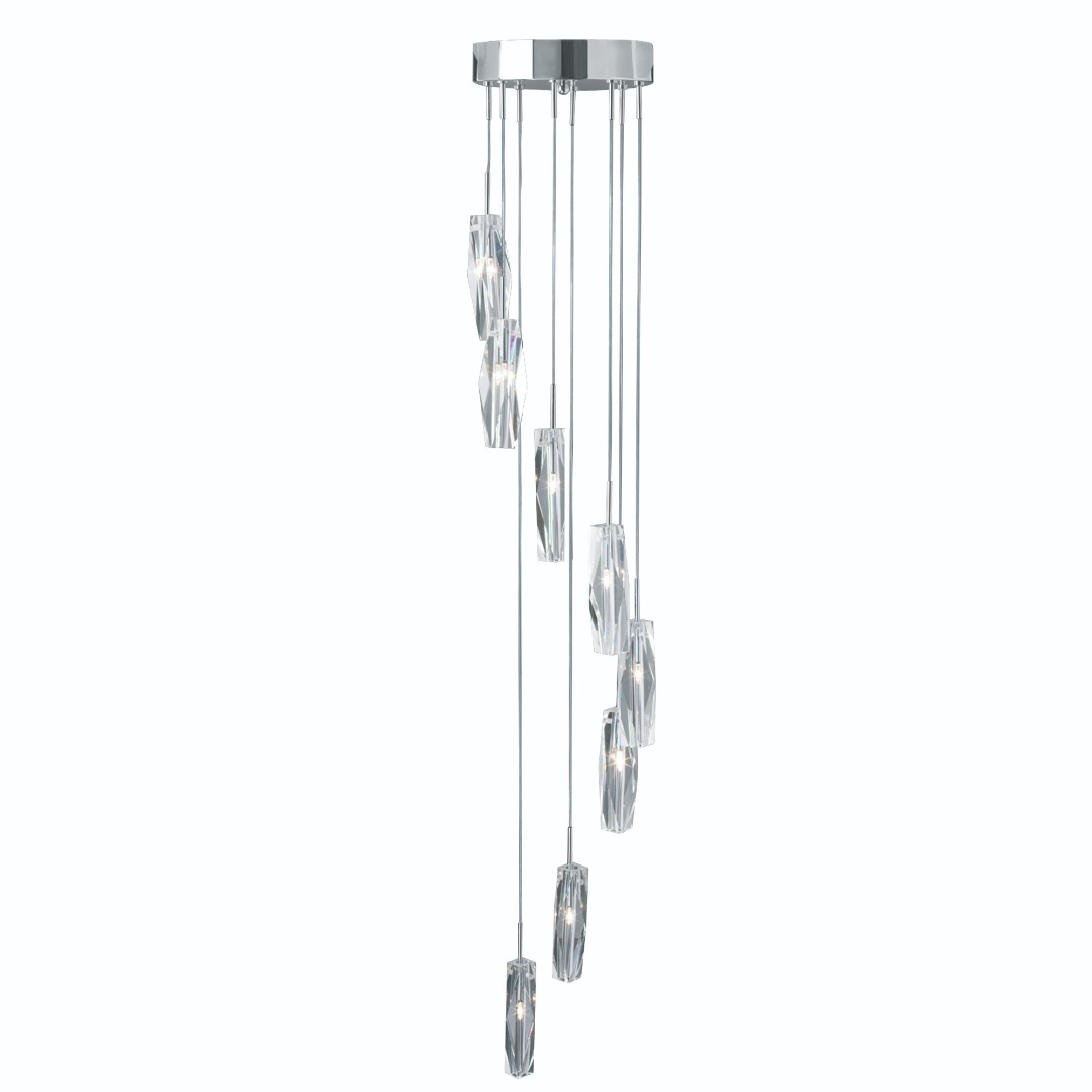 Til je interieur naar een hoger niveau met de 8-lichts hanglamp van Searchlight uit de Sculptured Ice collectie. De hanglamp heeft een chromen kleur en verfijnd glas. De lamp combineert een strak ontwerp met een fascinerende lichtval en vormt zo een blikvanger die imponeert. Inclusief LED lichtbronnen van 3000K, 33 watt en 853 lumen totaal. Door de maximale hoogte van maar liefst 300 cm is de lamp perfect in een ruime hal. Tijdens installatie is de gewenste hoogte te bepalen.