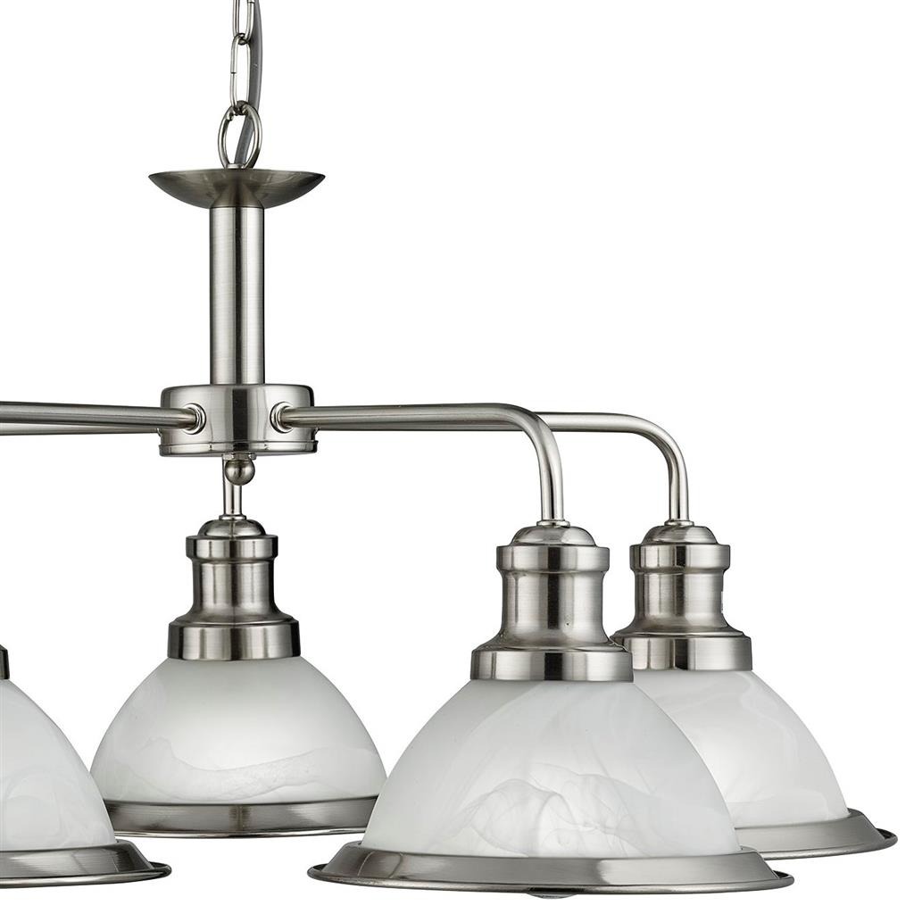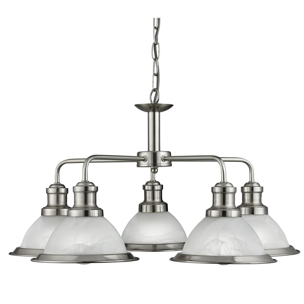 Een hanglamp uit de Bistro collectie van het merk Searchlight. De vijf alabaster glazen kappen van de lamp hebben een vintage uitstraling die in verschillende interieuren toepasbaar is. Het frame van de lamp heeft een zilveren kleur. Geïnspireerd op de sfeer van klassieke diners en bistro’s. De lamp is geschikt voor 5 lichtbronnen van maximaal 60 watt met E27 fitting. De lamp is bij installatie in hoogte verstelbaar. Leuk te combineren met de andere lampen uit de gelijknamige serie.
